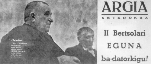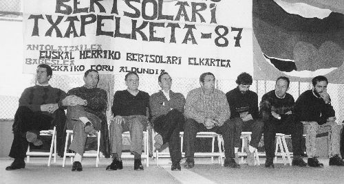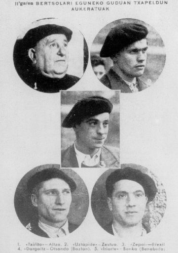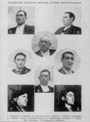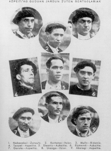 Eizmendi, Jon; Goikolea, Danel; Itzazelaia, Jon Iñaki; Iñurrategi, Felix; Loidi, Arantzazu; Lujanbio, Manuel "Txirrita"; Mujika, Joxe Mari "Anatx"; Olaizola, Manuel "Uztapide"; Sarasua, Aitor; Xabier "Euzkitze"