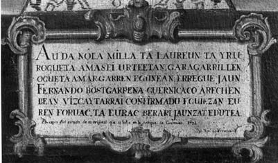 Gernikako (Juntetxeko?) horma bateko irudaren kopia, XIV. mendeko euskarazko testuaren kopia, 1773an egina (Es copia fiel sacada de su original que se halla en la Antigua de Guernica. 1773, Jph. Ign. de Urrutia): " Au da nola milla ta lureun ta yruroegueta amasei urteetan garagarrilen ogueta amargarren egunean errege jaun Fernando bostgarrena guernicaco arechen bean bizcaitarrai confirmadu eguiezan euren foruac eta eurac bera jauntzat edutea " --