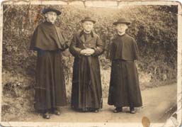 Resurrección Maria de Azkue zutik bi apaizen artean, eskutitz batetan bidalitako argazkia. --