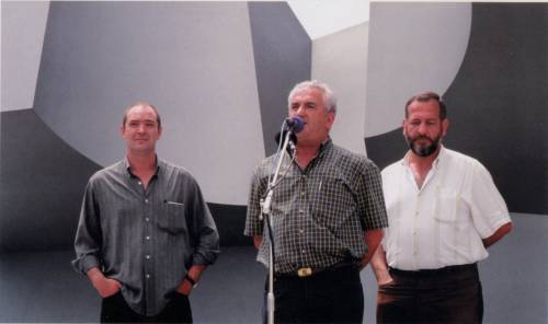 Jorge Oteizak bertsolaritzari dedikatutako eskulturaren aurrean. Imanol Lazkano kantuan, aldamenean Andoni Egaña eta Sebastian Lizaso --