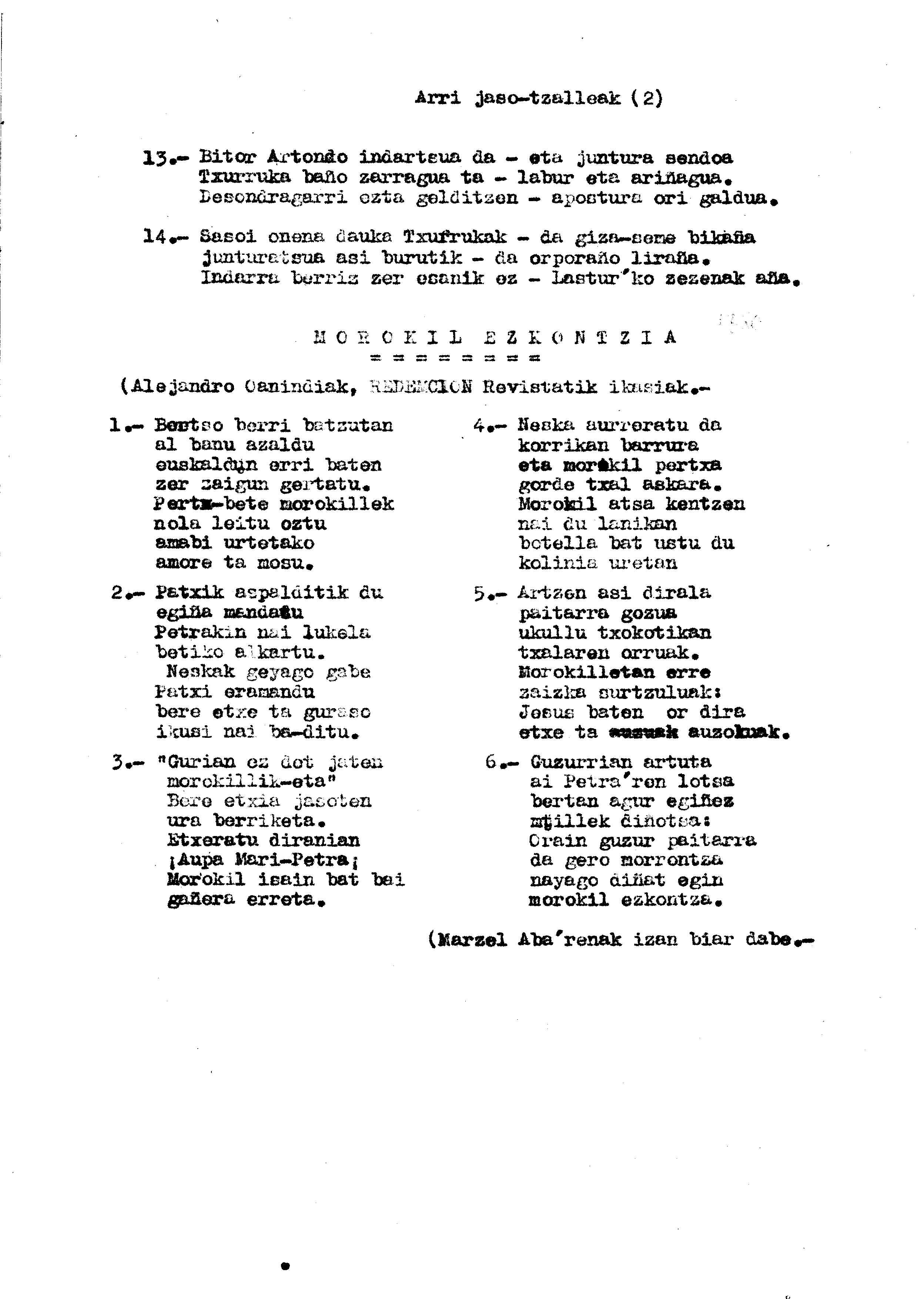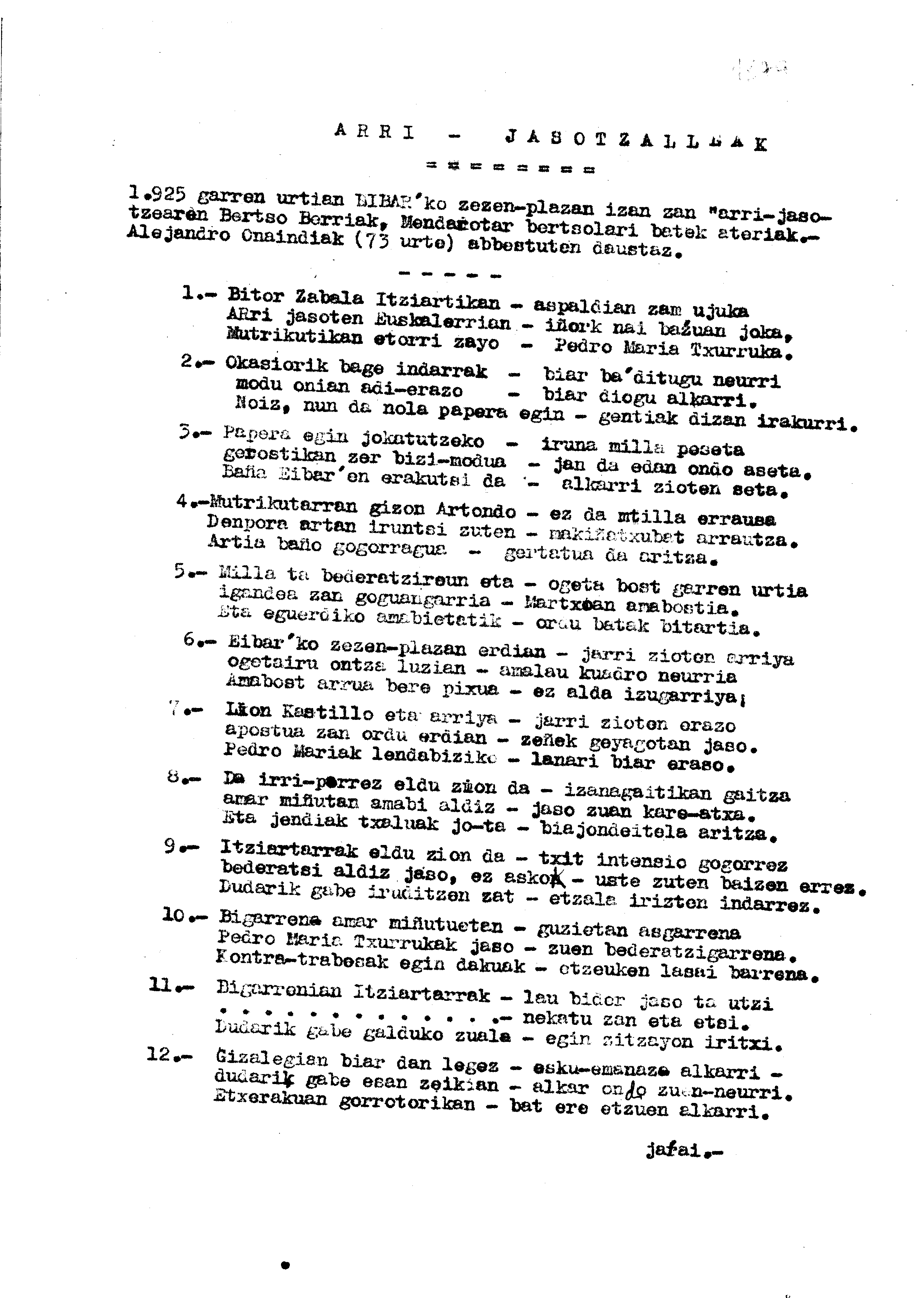 1925 garren urtian Eibar'ko zezen-plazan izan zan "arri-jasotzearen Bertso Berriak, Mendarotar bertsolari batek ateriak". Alejandro Onaindiak (73 urte) abestuten daustaz.