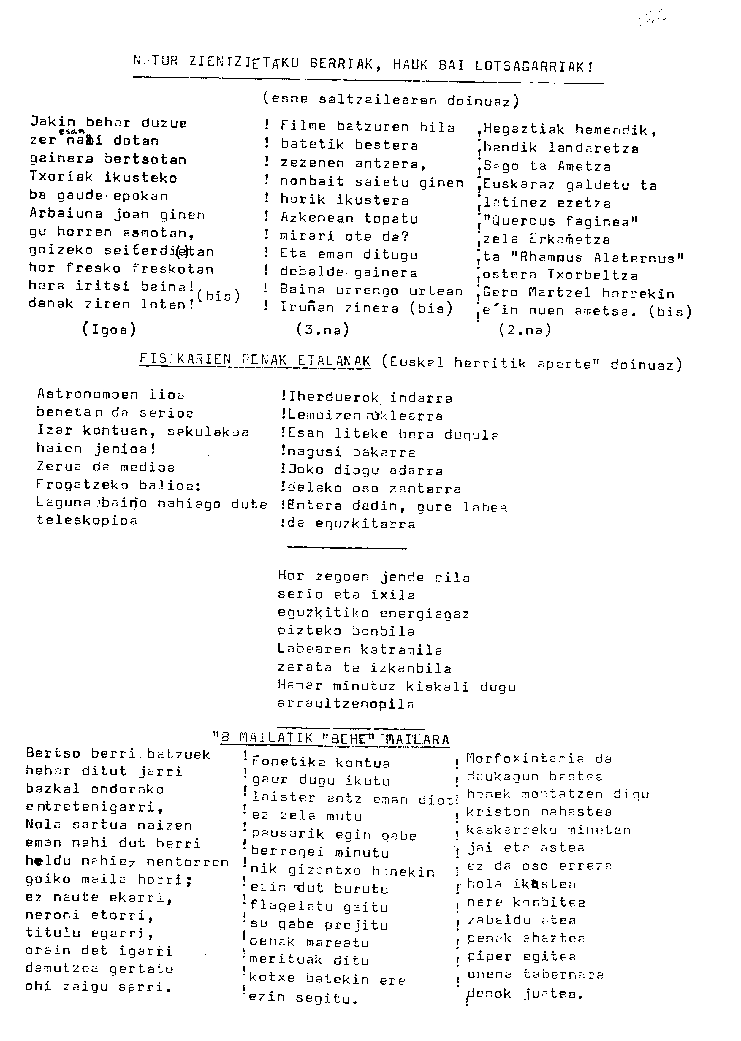 Bertsolaritza. Bertso paperak: Izenburua: Natur zientzietako berriak, hauk bai lotsagarriak / Fisikarien penak etalanak / B mailatik behe mailara