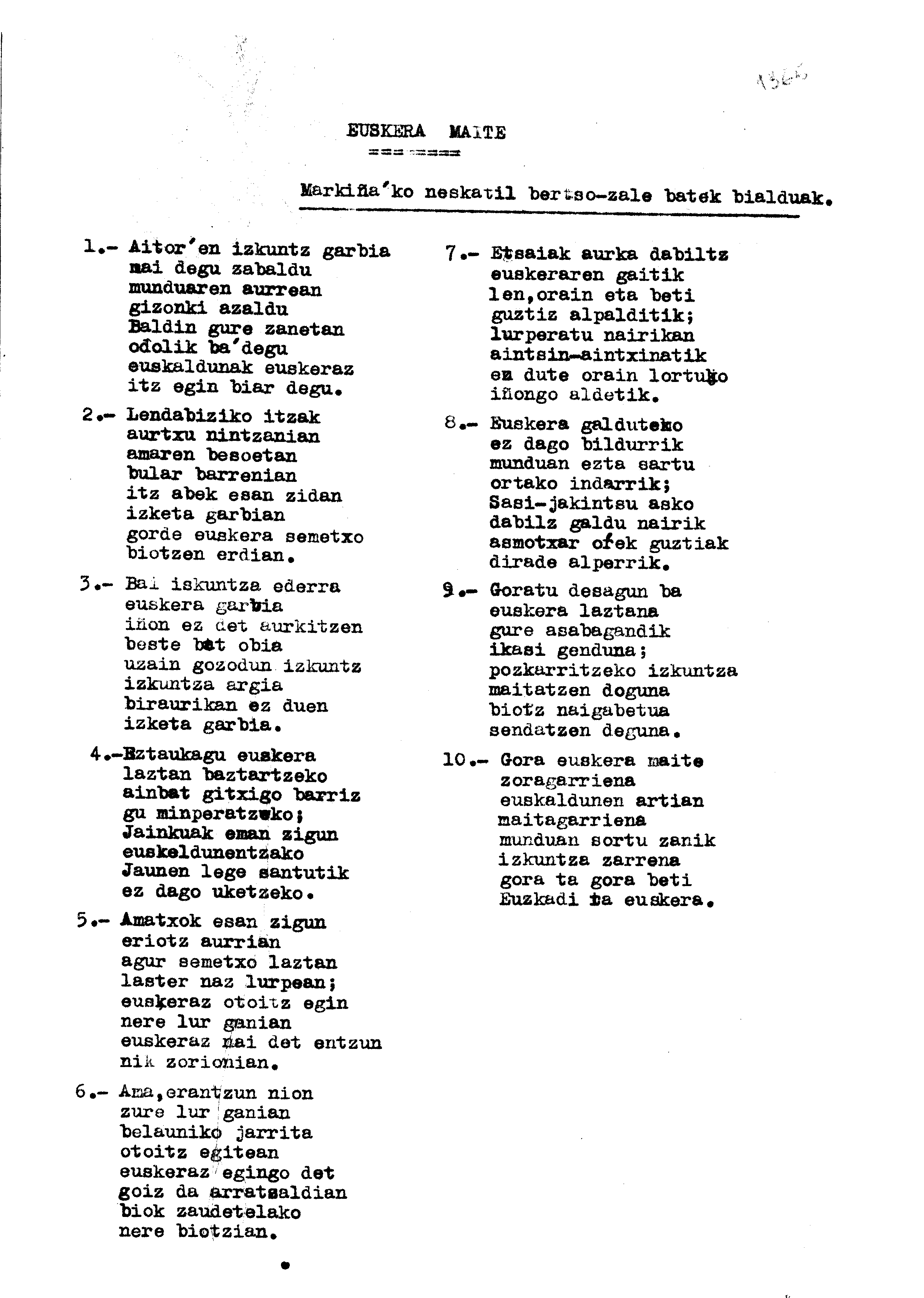 Bertsolaritza. Bertso paperak: Izenburua: Euskera maite. Markiñako neskatil bertsozale batek bialduak