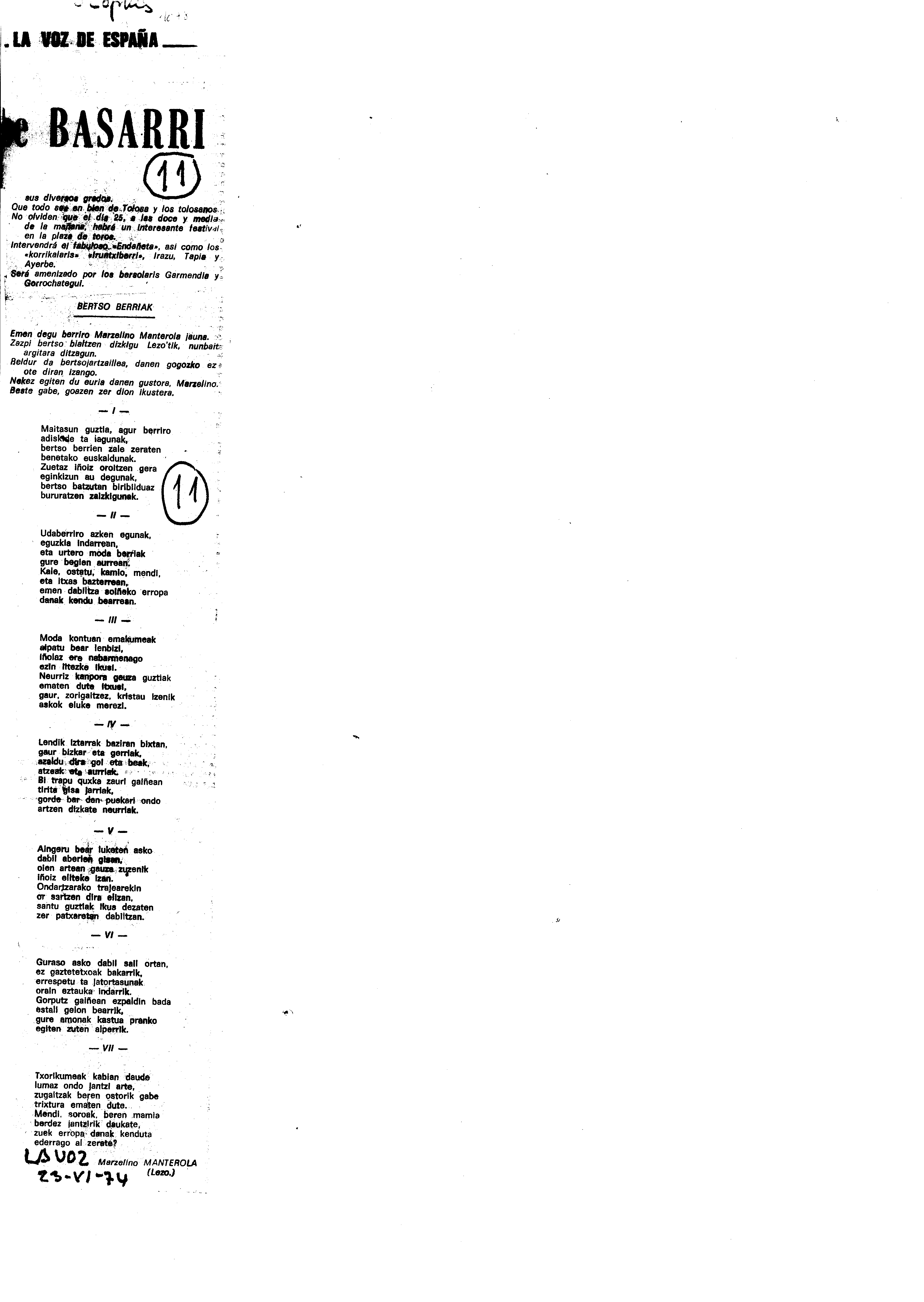 Mendaro Txirristaka Bertso-Paper Saria (1. 1974)