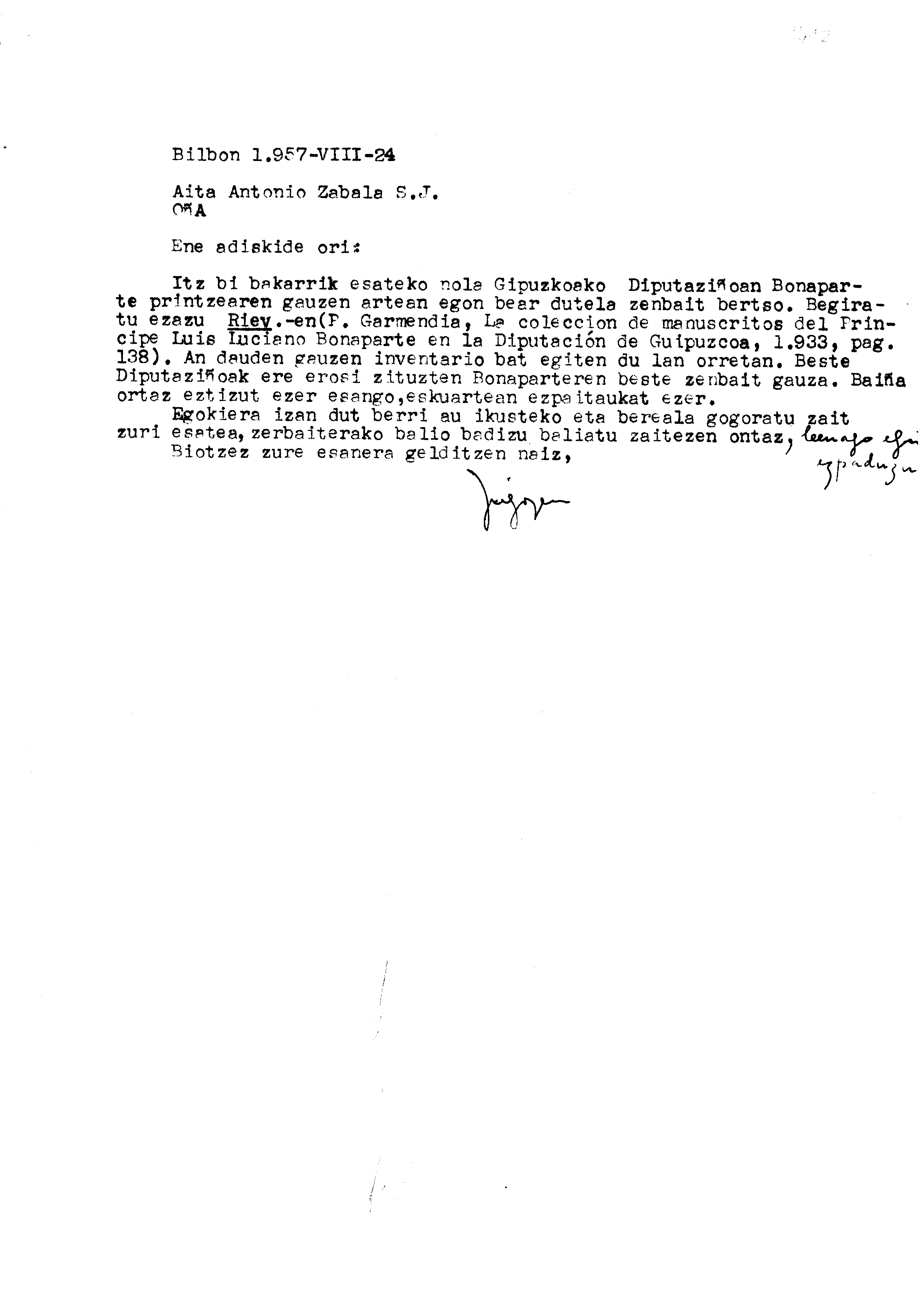 Alfonso Irigoienen Artxiboa > Euskaltzaindia > Korrespondentzia