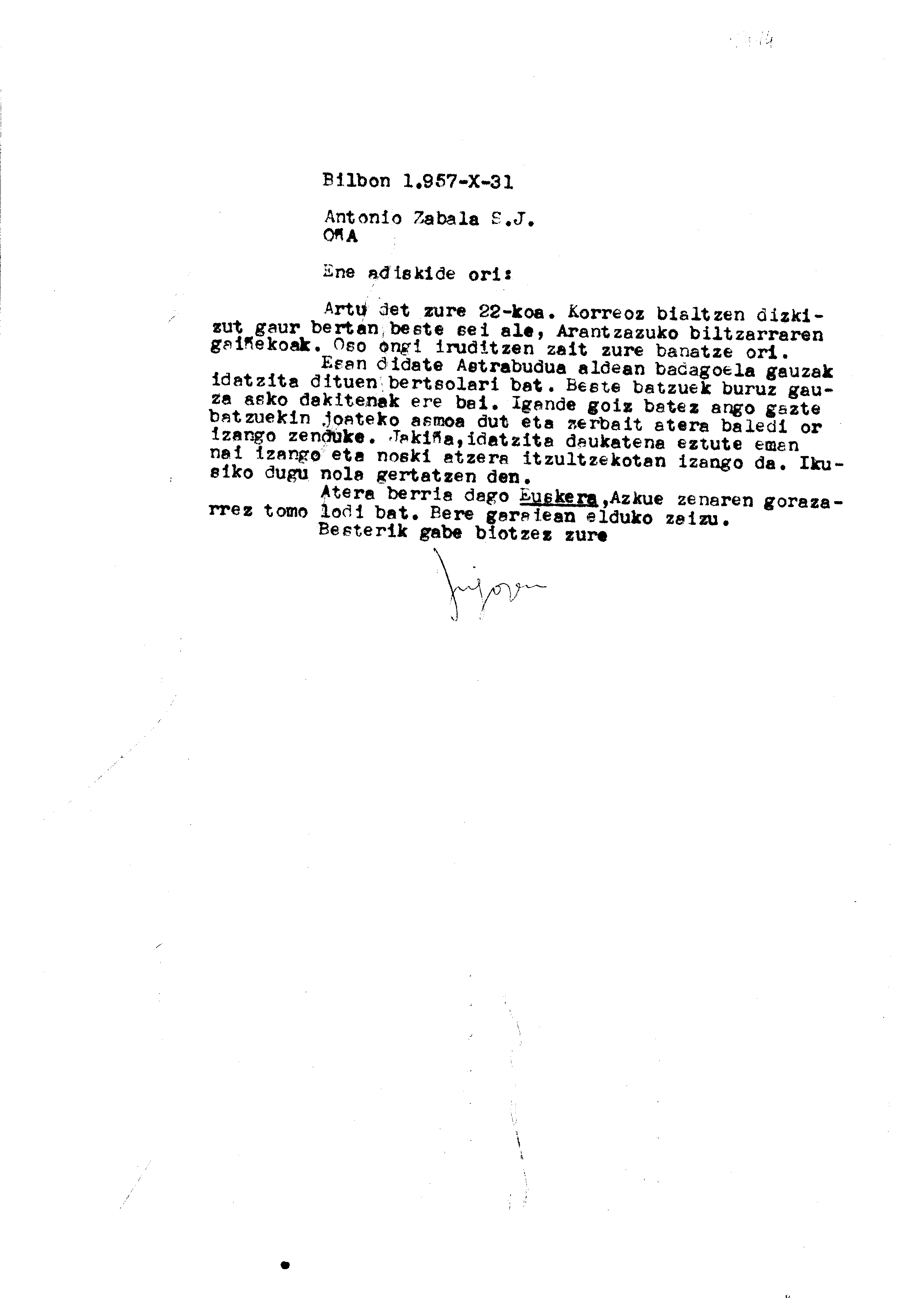 Euskaltzaindia. Gutunak: Irigoienen gutuna Arantzazuko biltzarrari eta Astrabuduako bertsolari baten bertso-paperei buruz
