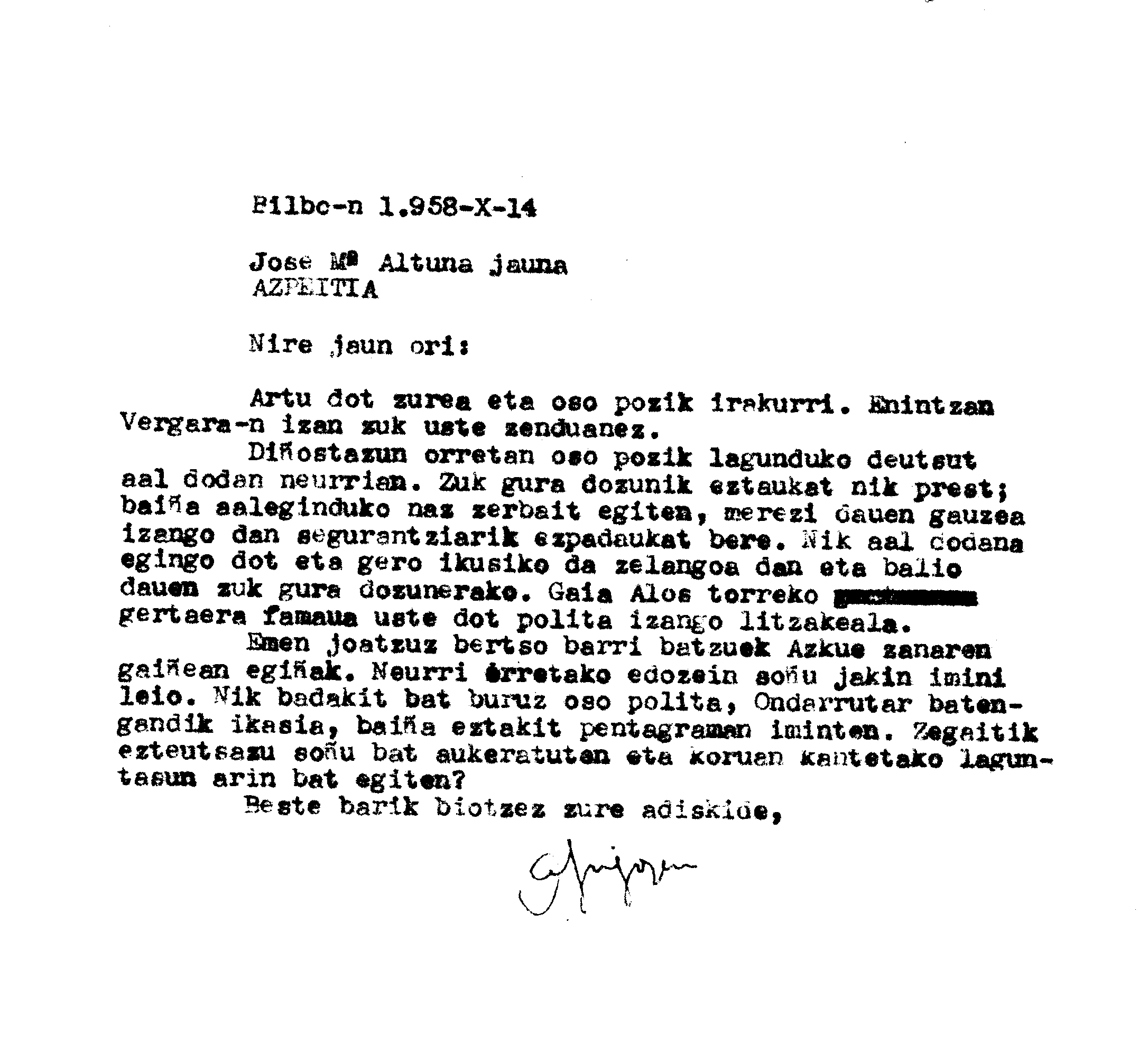 Gutunak: Azkue zenaren gainean egindako bertso batzuk bidaltzen dizkio
