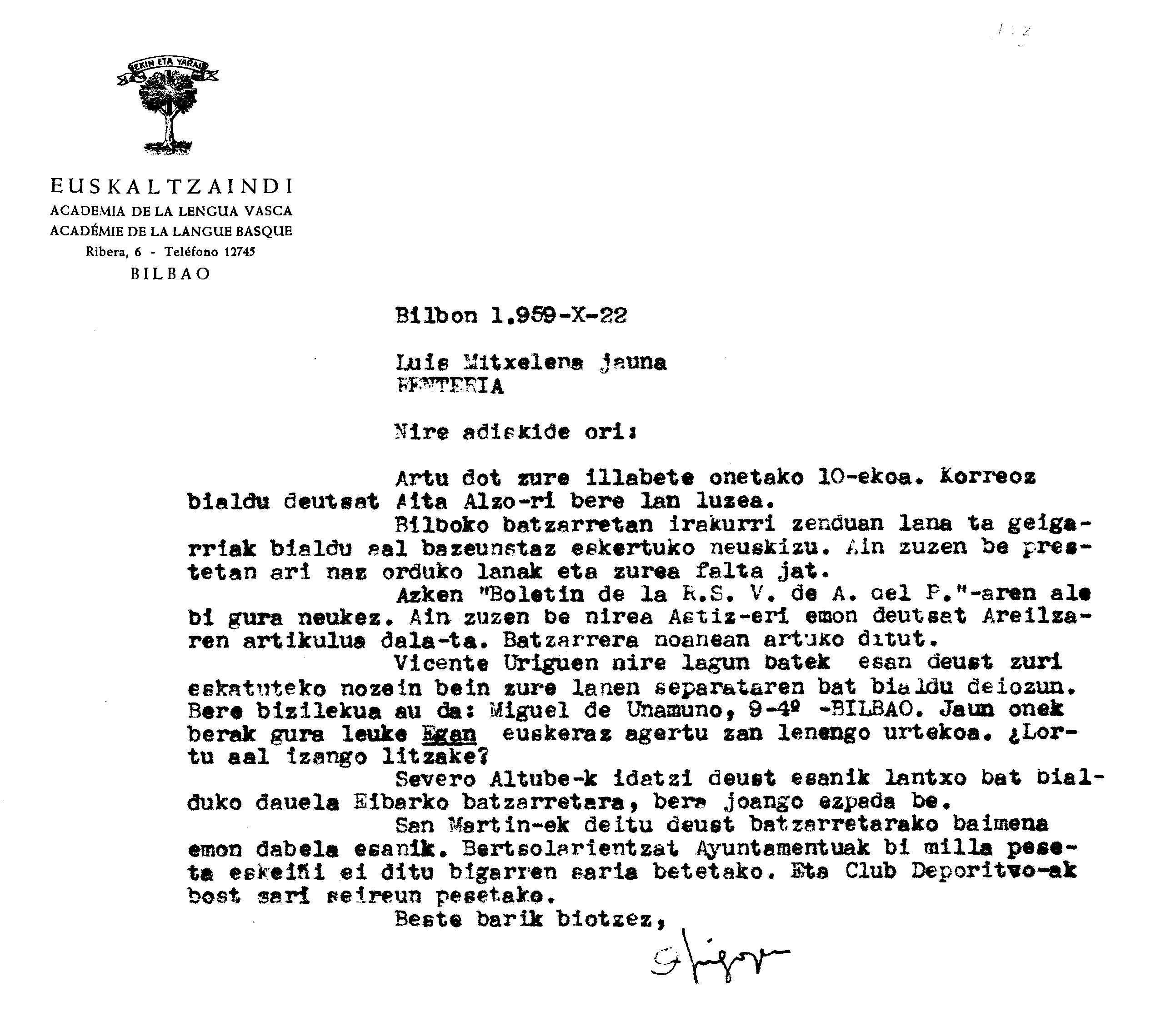 Alfonso Irigoienen Artxiboa > Euskaltzaindia > Korrespondentzia