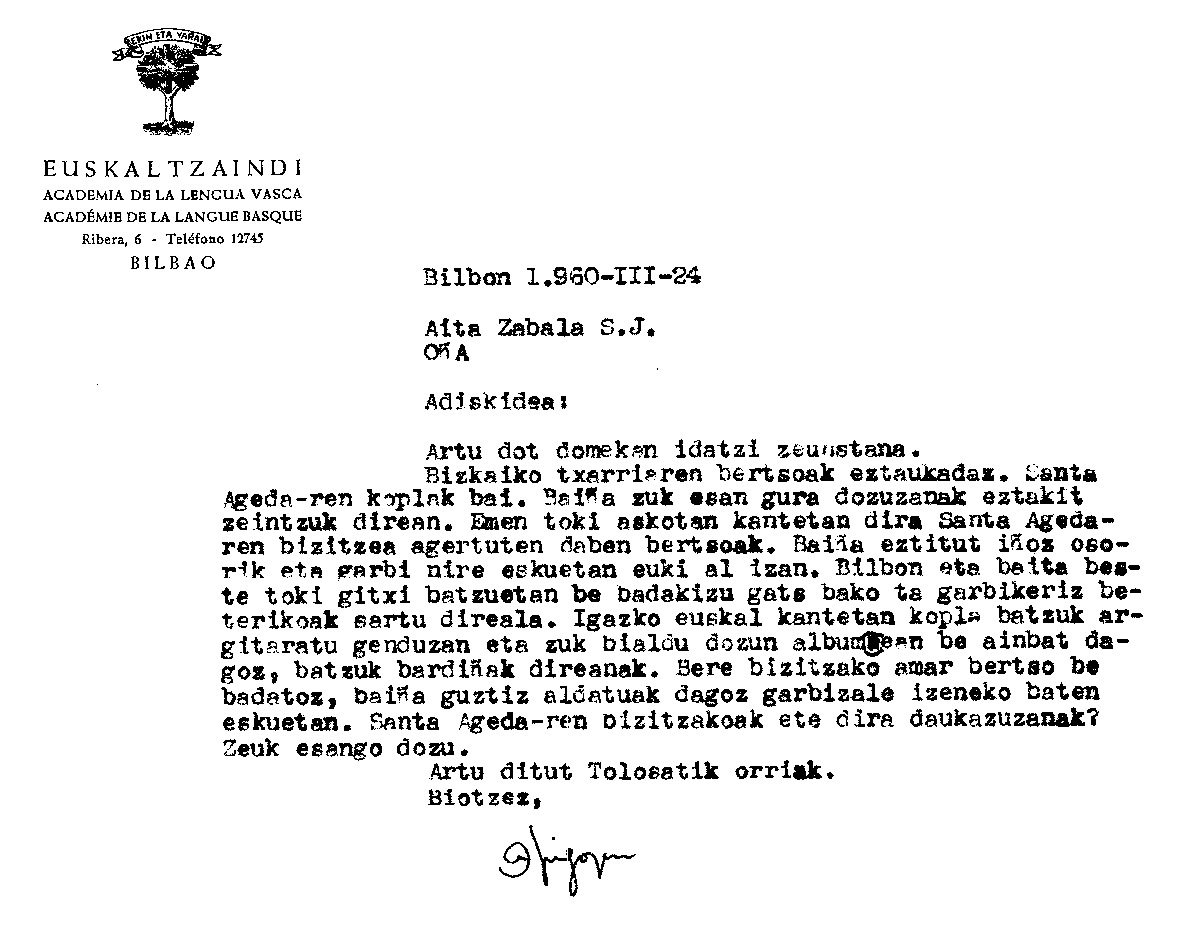 Alfonso Irigoienen Artxiboa > Euskaltzaindia > Korrespondentzia