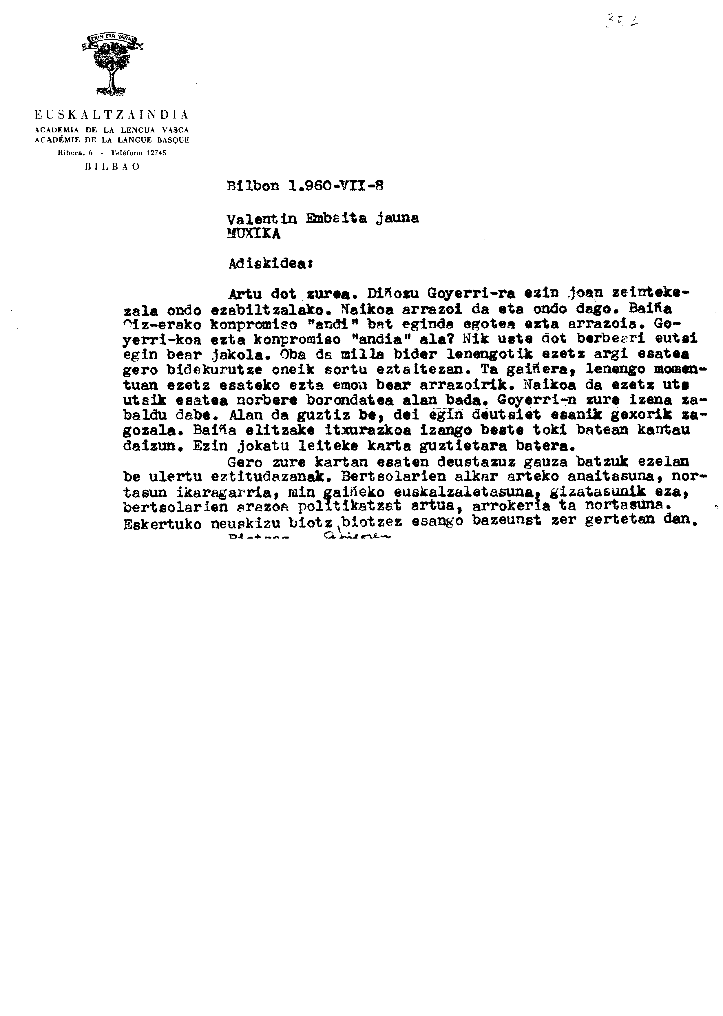 Alfonso Irigoienen Artxiboa > Euskaltzaindia > Korrespondentzia