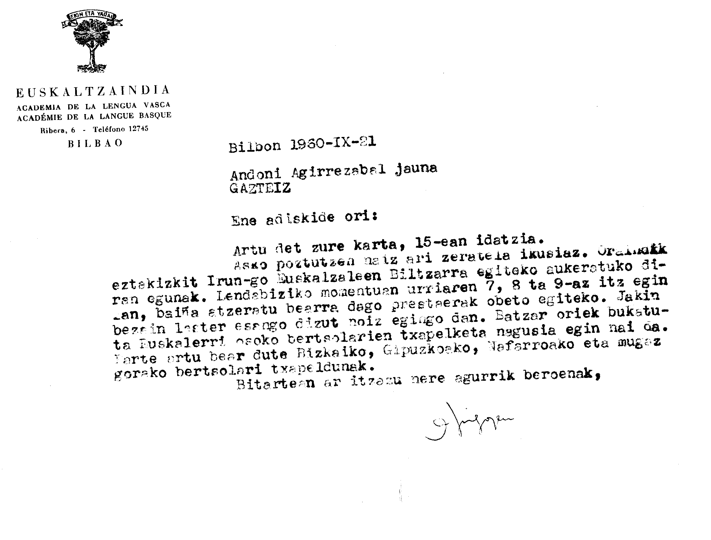 Alfonso Irigoienen Artxiboa > Euskaltzaindia > Korrespondentzia