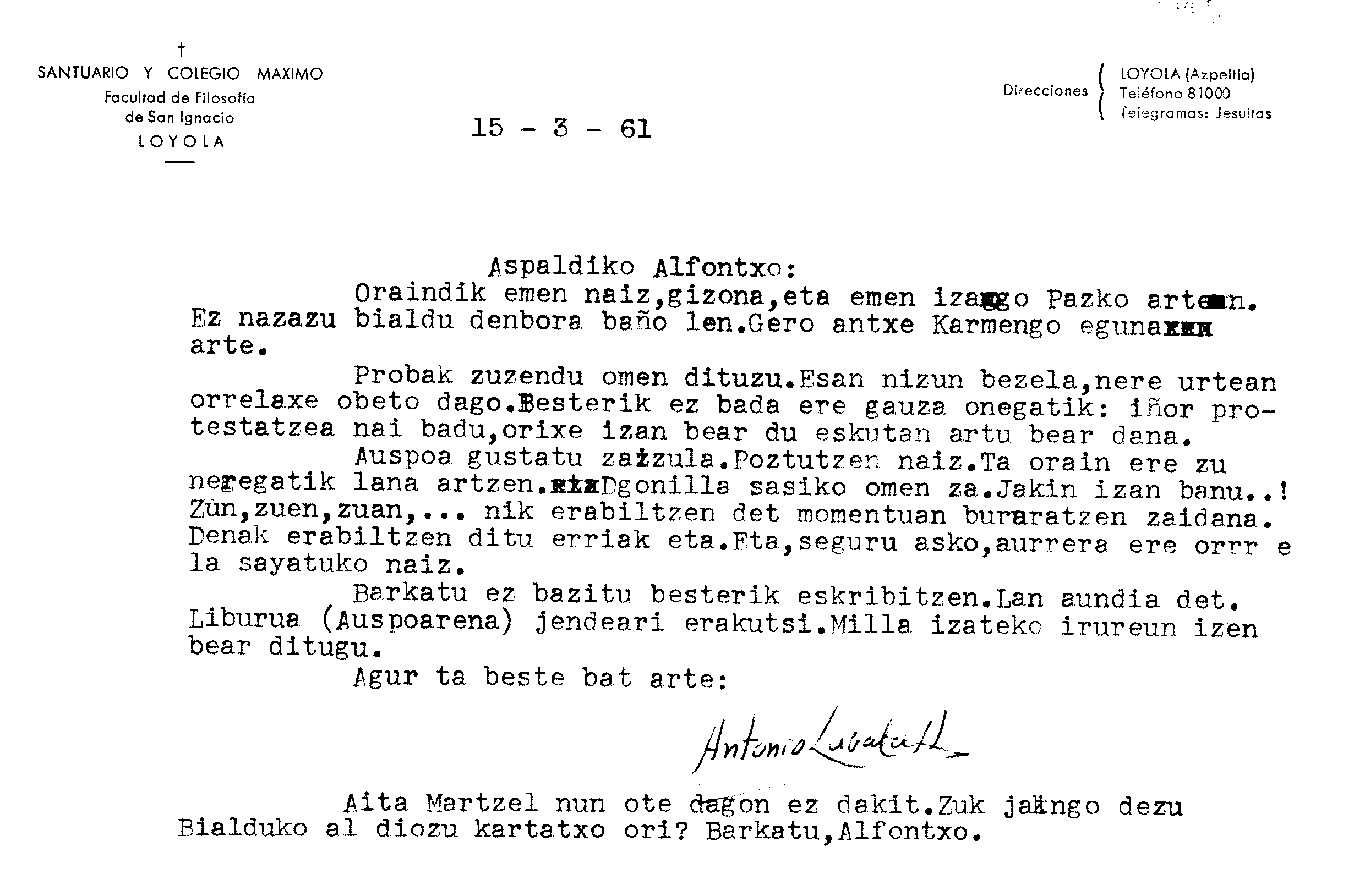Alfonso Irigoienen Artxiboa > Euskaltzaindia > Korrespondentzia