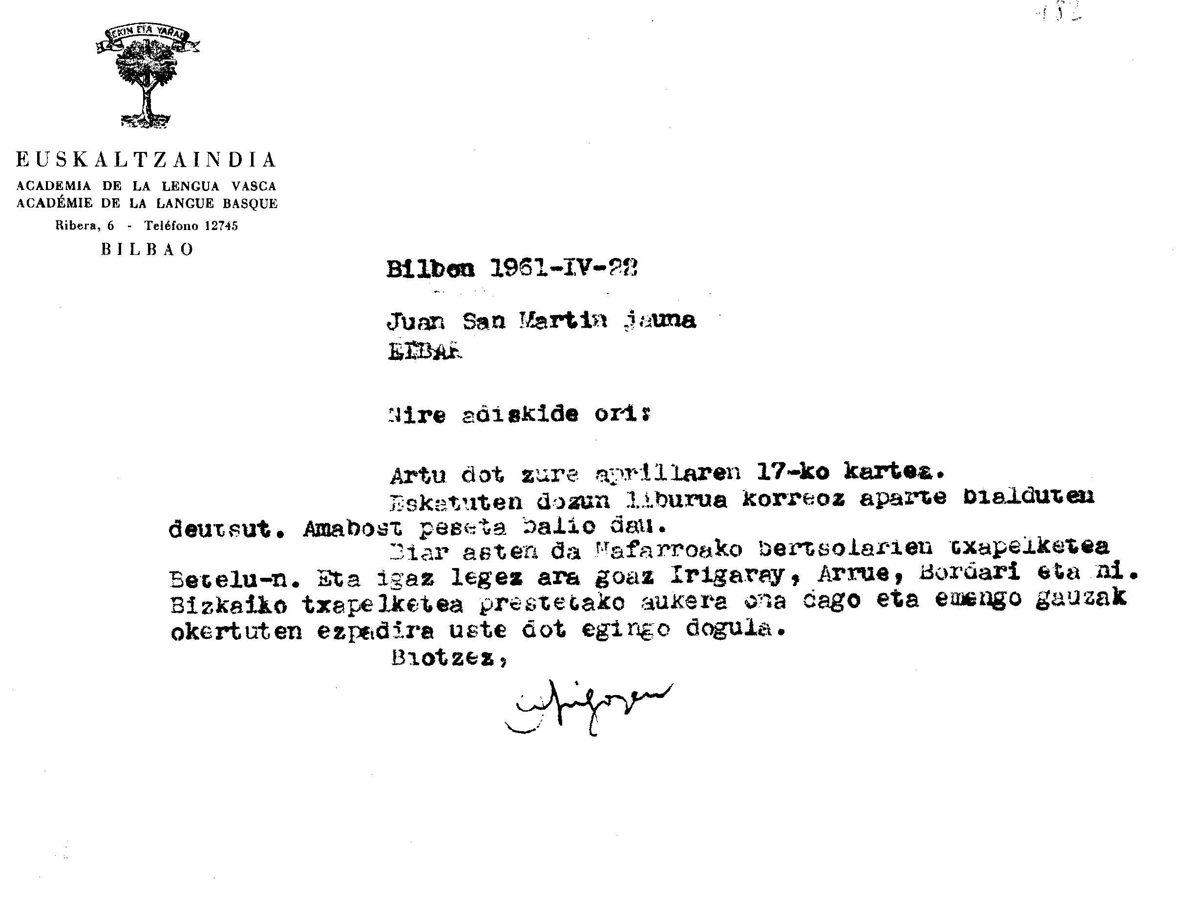 Alfonso Irigoienen Artxiboa > Euskaltzaindia > Korrespondentzia