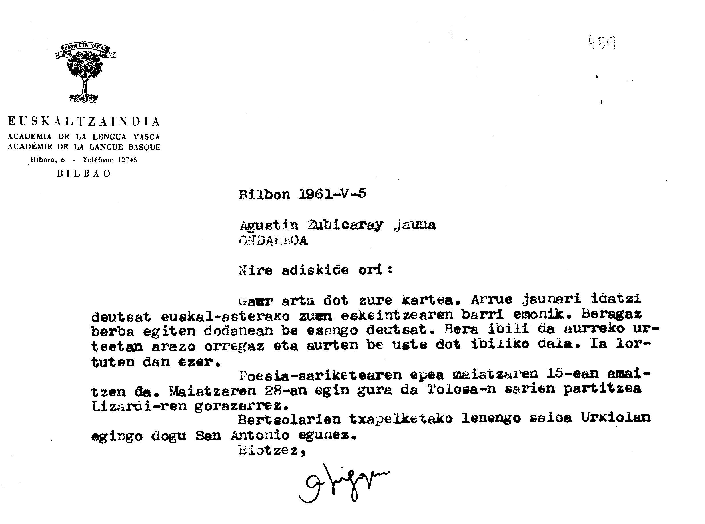 Alfonso Irigoienen Artxiboa > Euskaltzaindia > Korrespondentzia