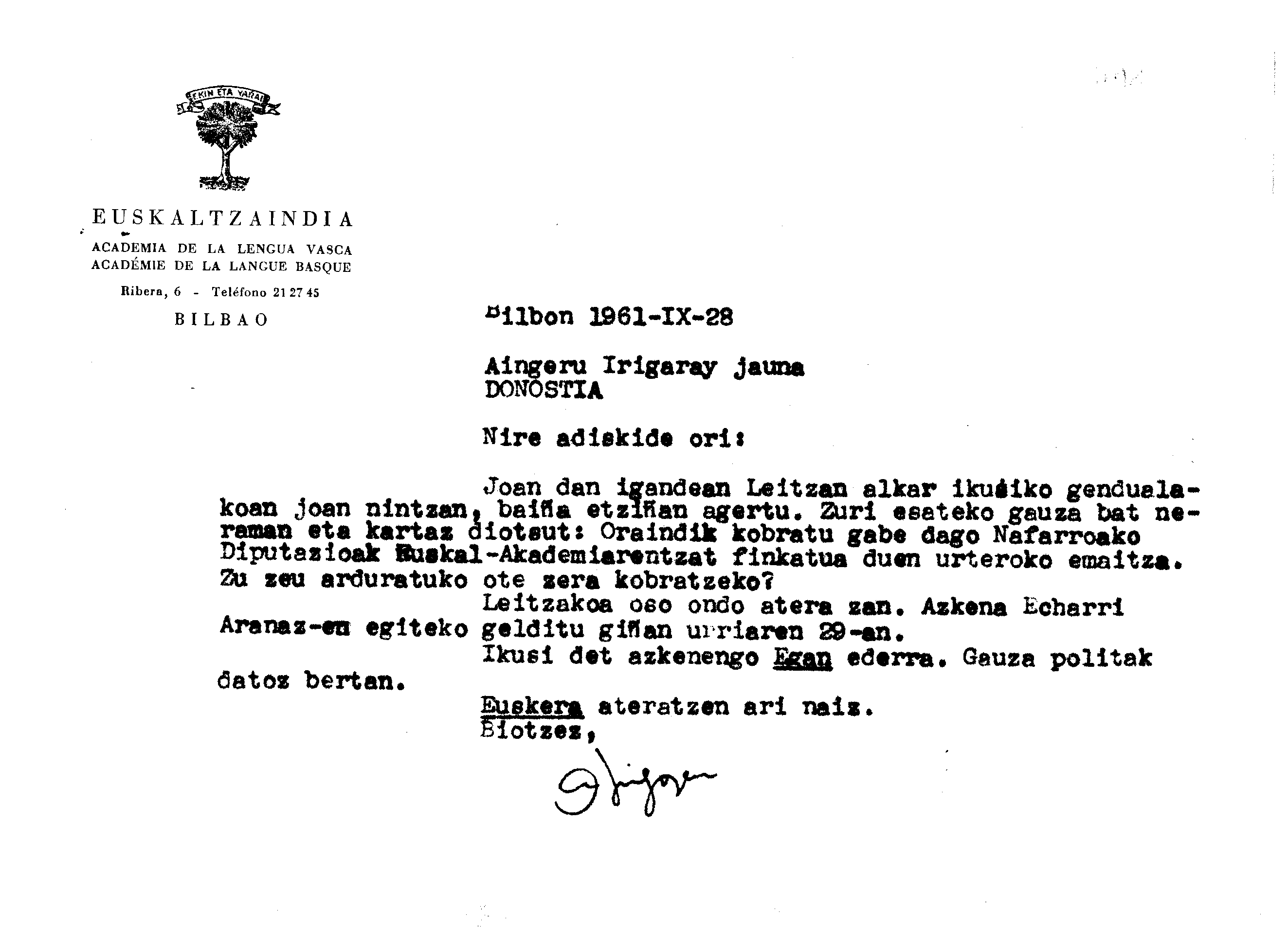 Alfonso Irigoienen Artxiboa > Euskaltzaindia > Korrespondentzia