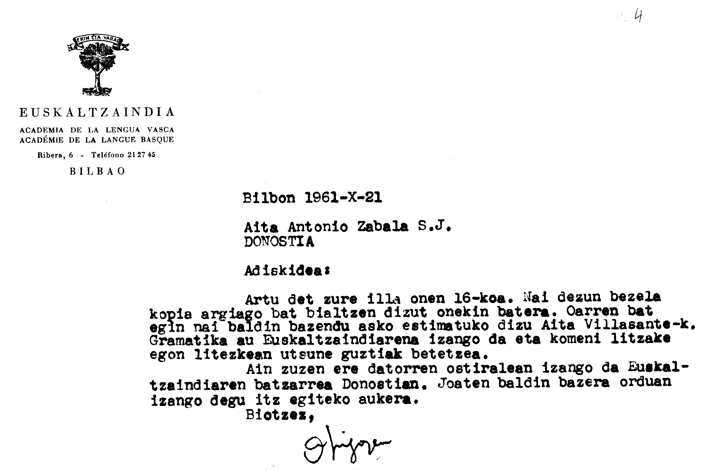 Alfonso Irigoienen Artxiboa > Euskaltzaindia > Korrespondentzia