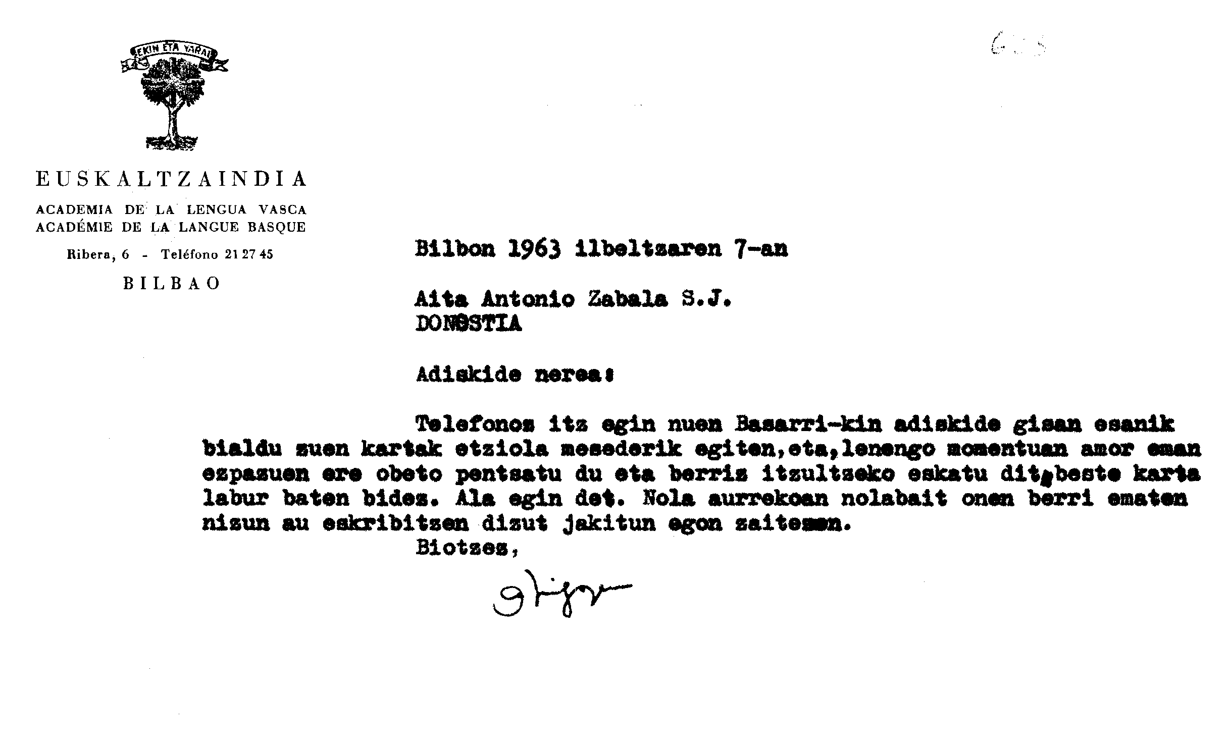 Alfonso Irigoienen Artxiboa > Euskaltzaindia > Korrespondentzia