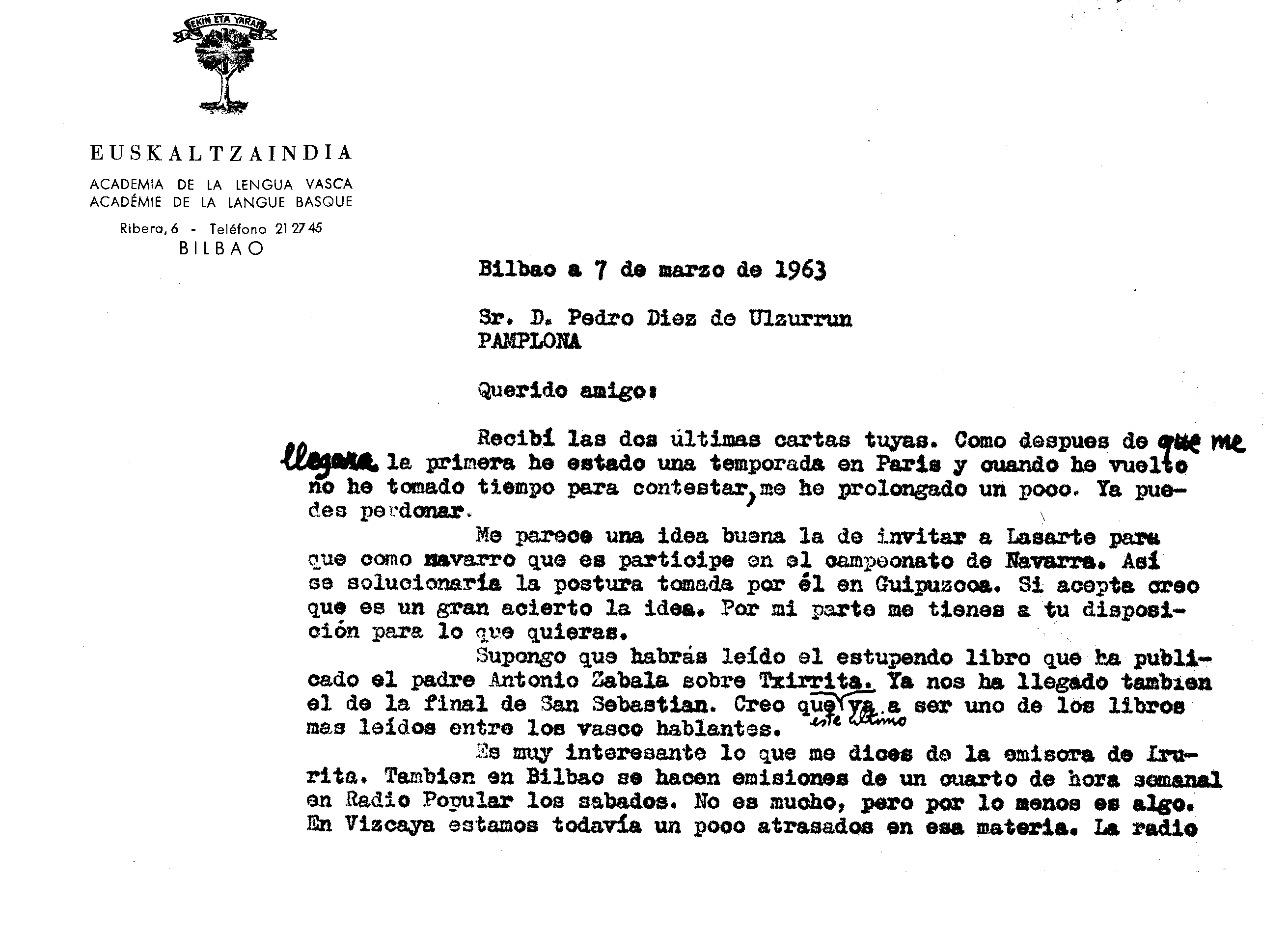 Alfonso Irigoienen Artxiboa > Euskaltzaindia > Korrespondentzia