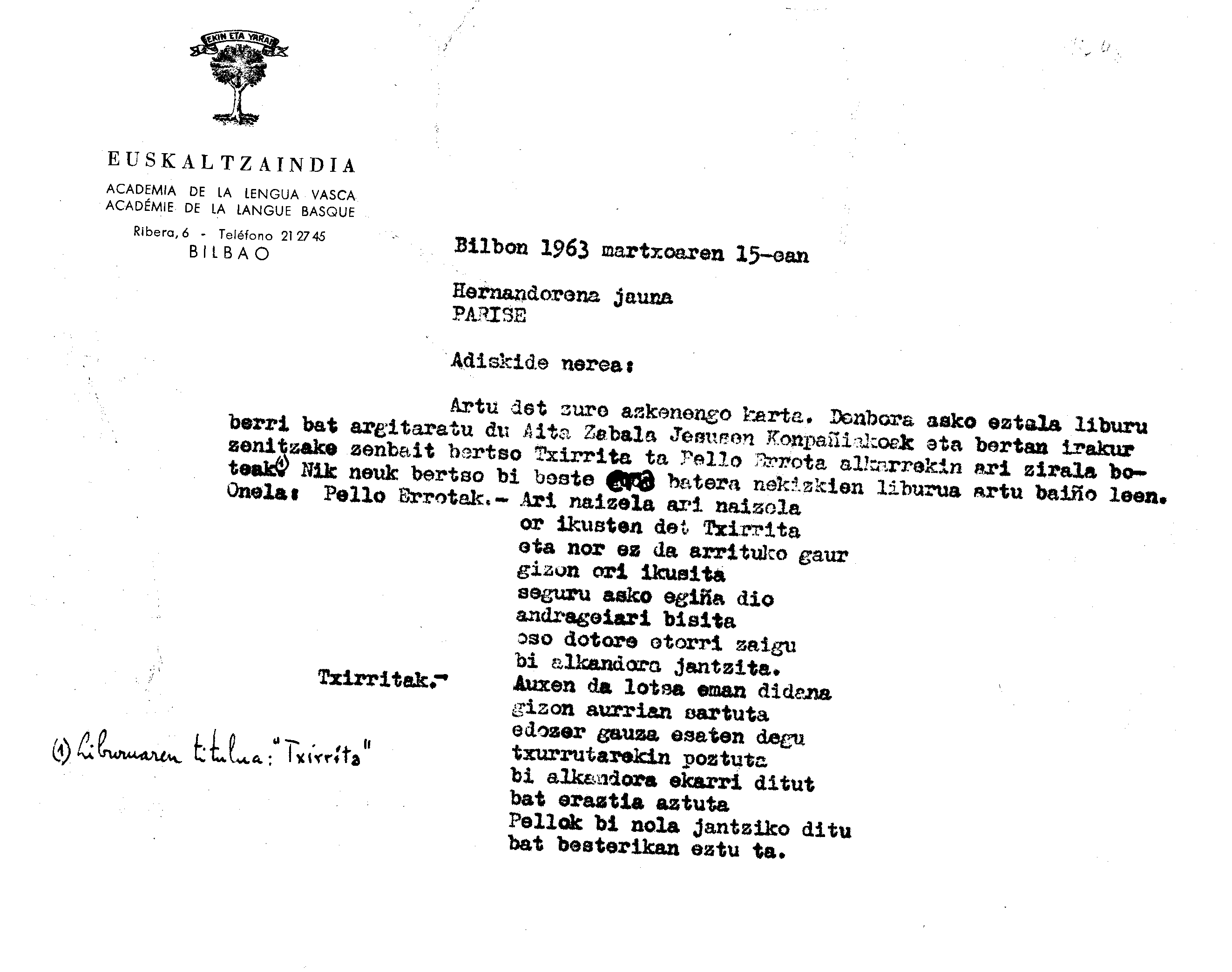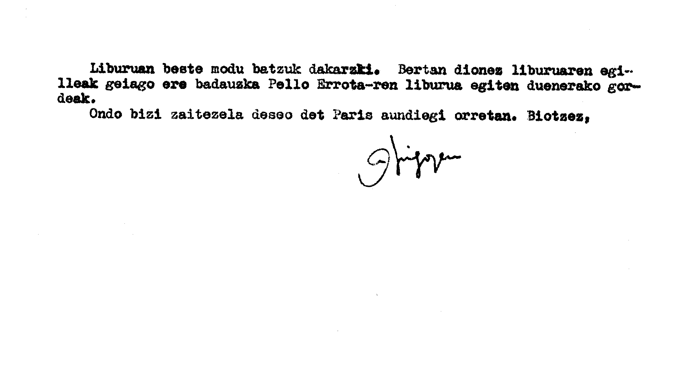 Euskaltzaindia. Gutunak: Irigoienen gutuna Pello Errotari buruzko liburu bati buruz