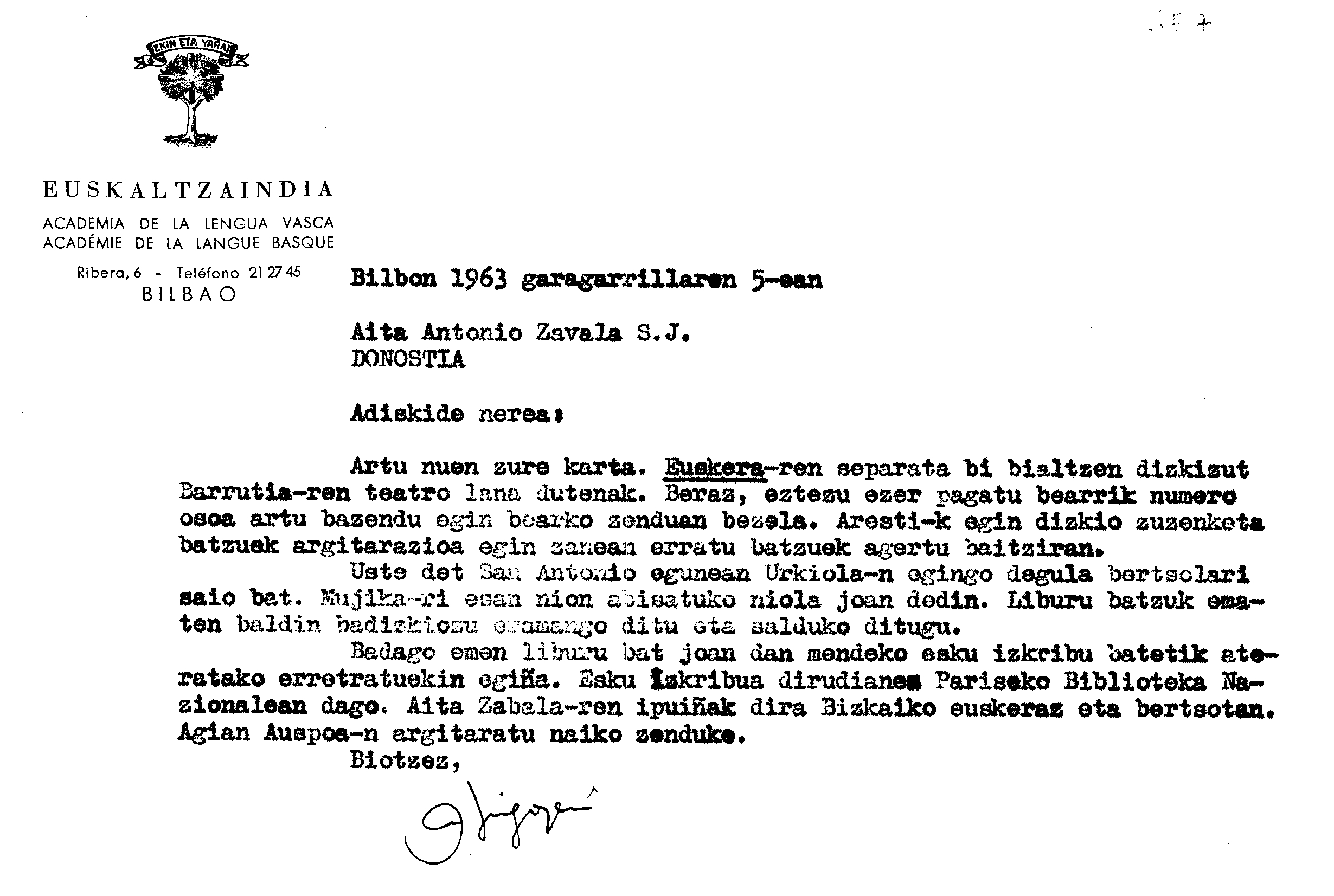 Alfonso Irigoienen Artxiboa > Euskaltzaindia > Korrespondentzia