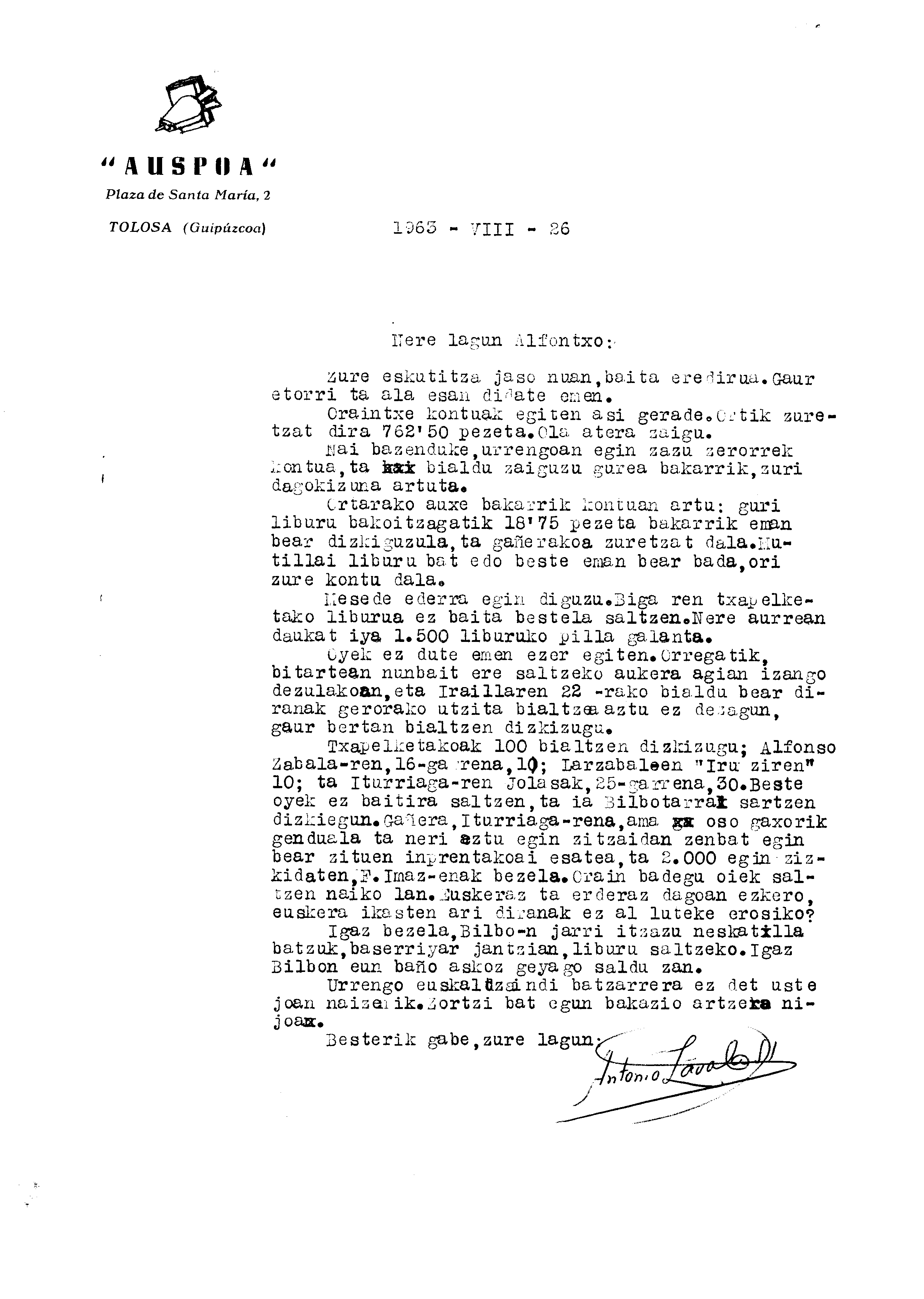 Euskaltzaindia. Gutunak: Zavalaren gutuna Auspoaren liburu salmenten gain