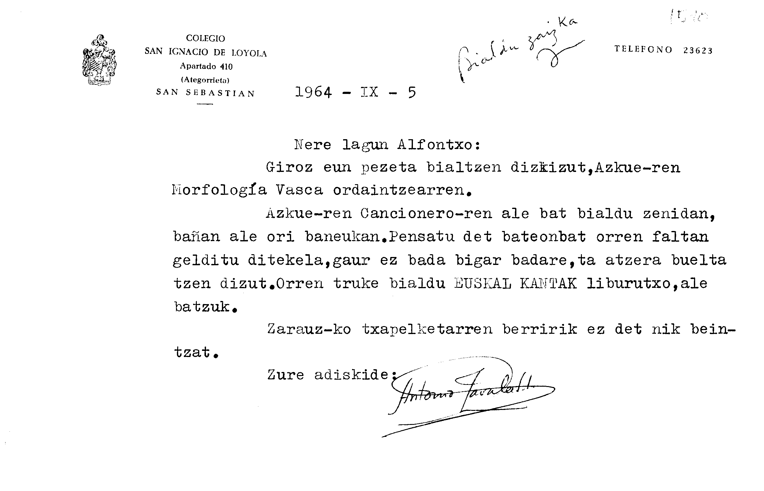 Alfonso Irigoienen Artxiboa > Euskaltzaindia > Korrespondentzia