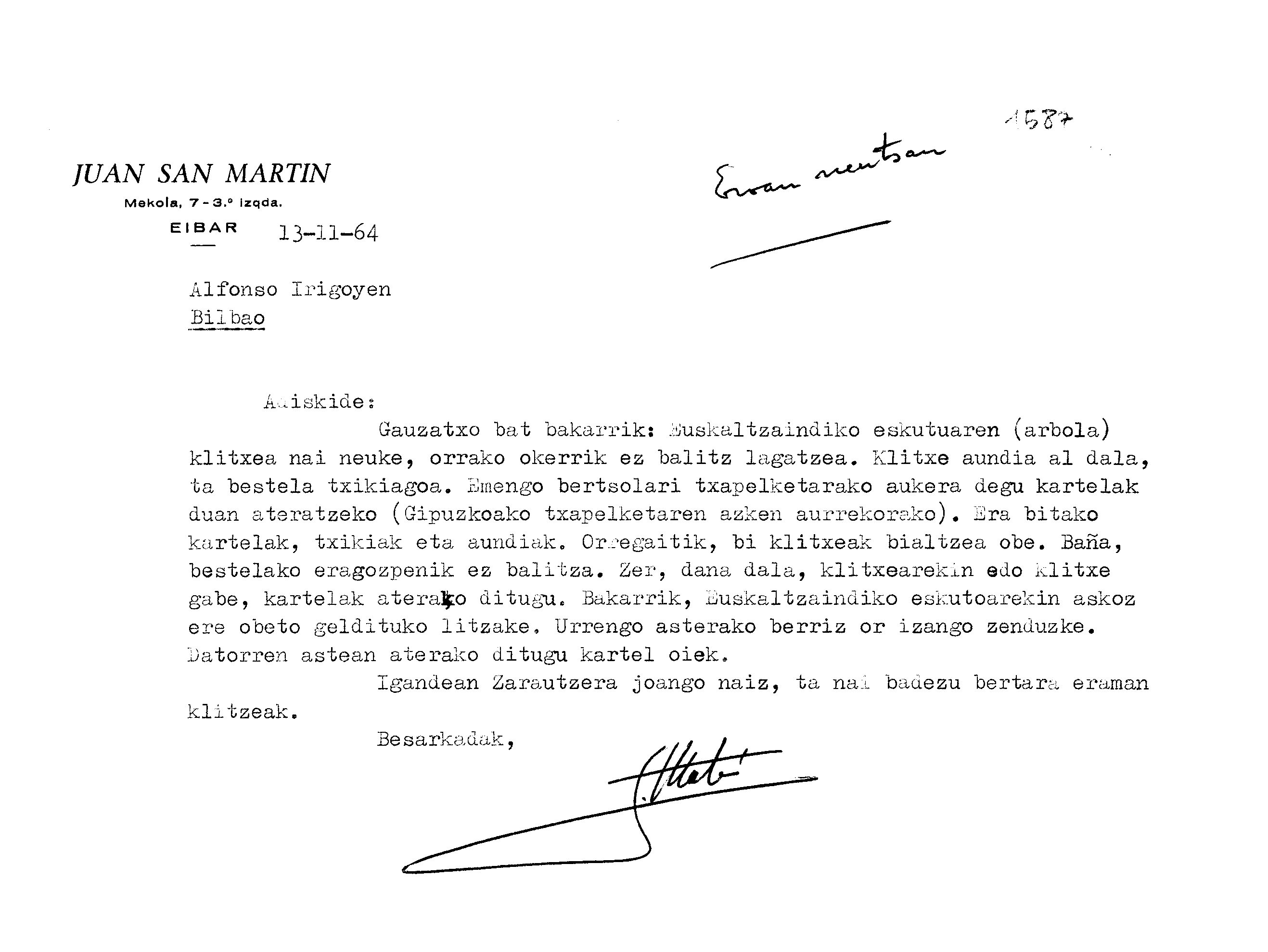 Euskaltzaindia. Gutunak: San Martinen gutuna Euskaltzaindiko armarria eskatuz