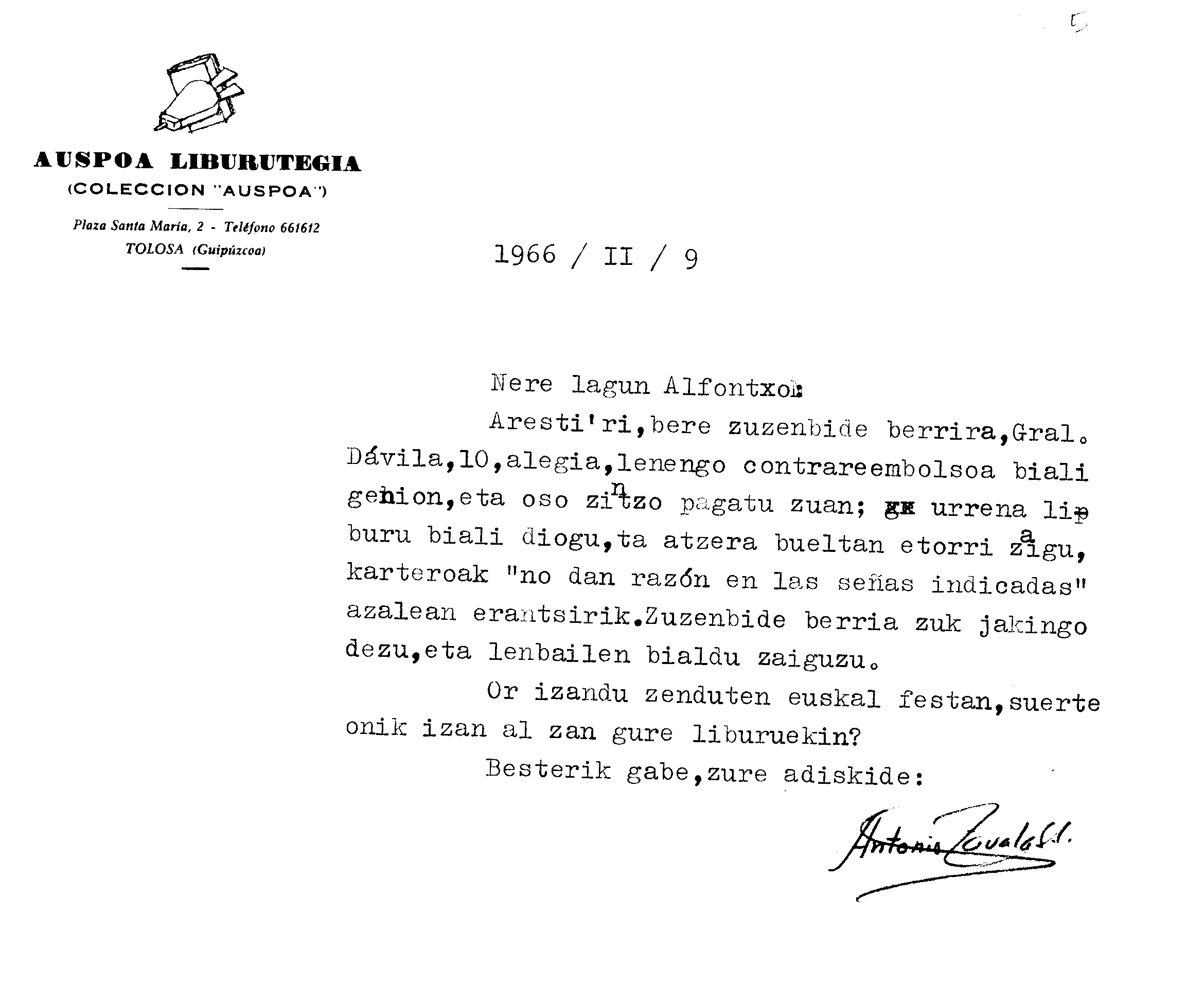 Euskaltzaindia. Gutunak: Zavalaren gutuna Auspoako harpidedun bati buruz