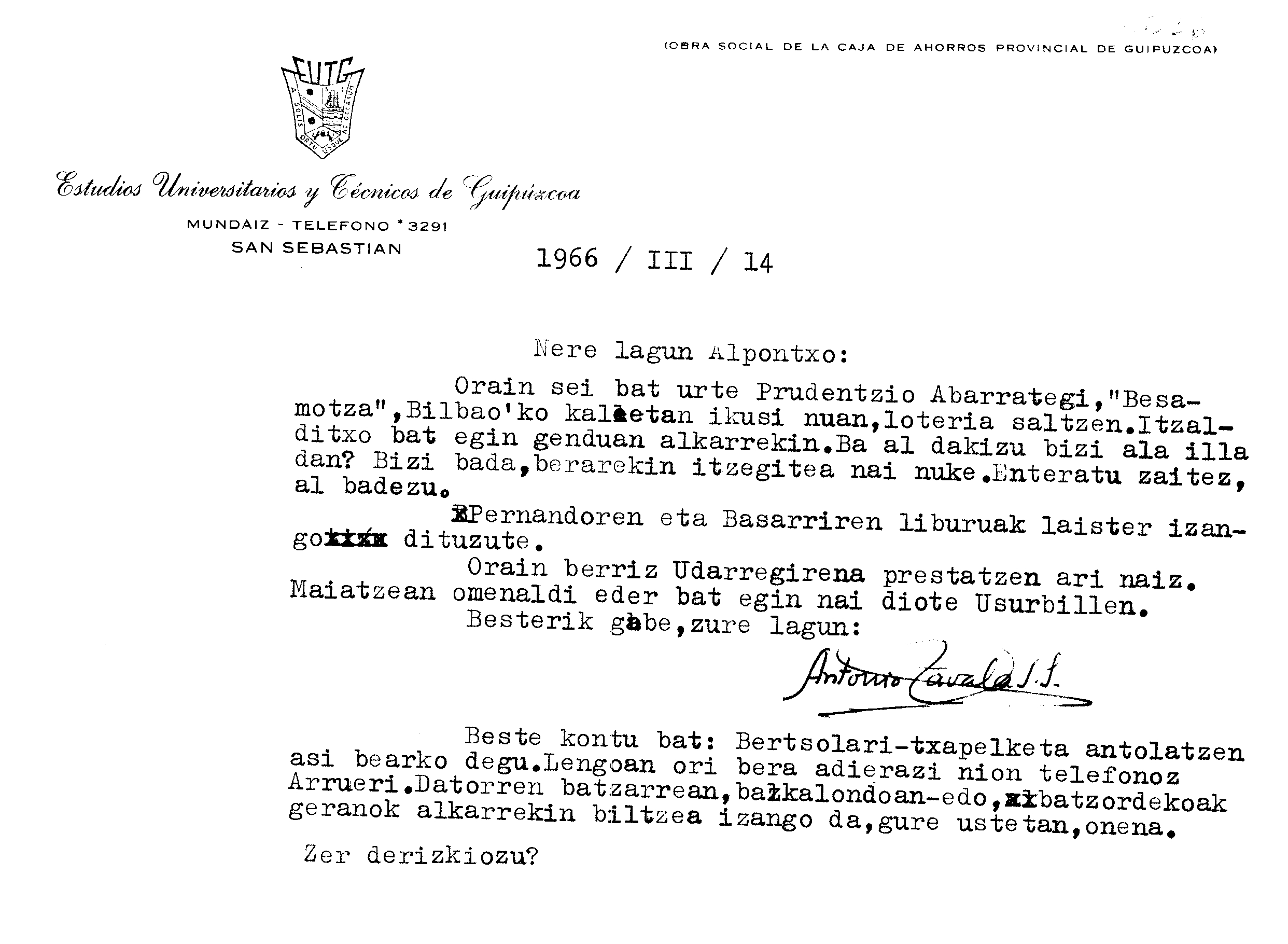 Euskaltzaindia. Gutunak: Zavalaren gutuna Prudentzio Abarrategiri buruz galdezka eta Bertsolari Txapelketa Nagusia antolatzeari buruz