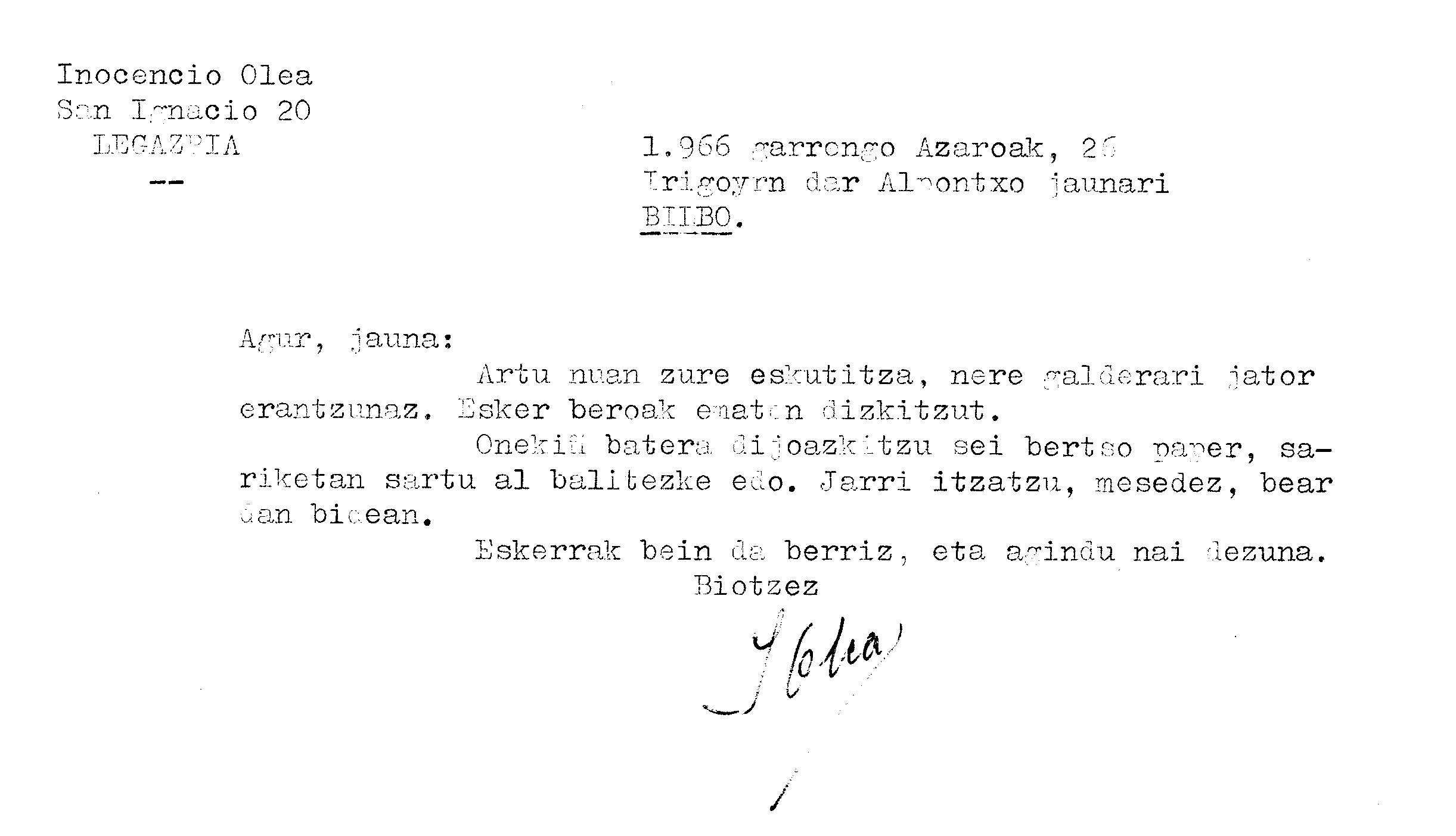 Euskaltzaindia. Gutunak: Olearen gutuna, Xenpelar sarirako bertso-paperei buruz