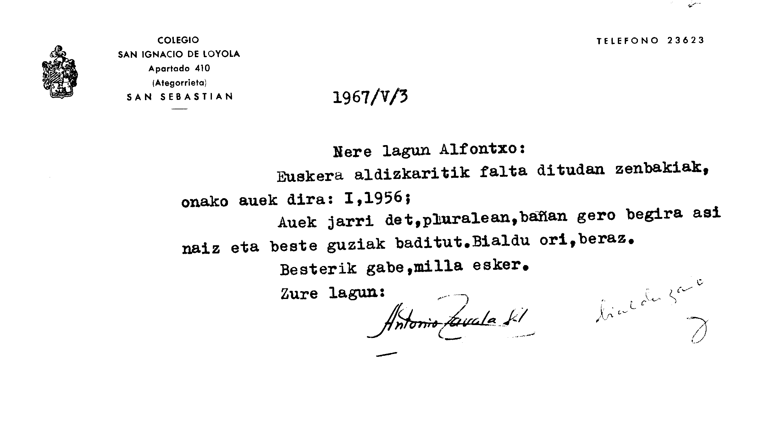 Euskaltzaindia. Gutunak: Zavalaren gutuna Euskera aldizkariaren zenbaki batzuk eskatuz