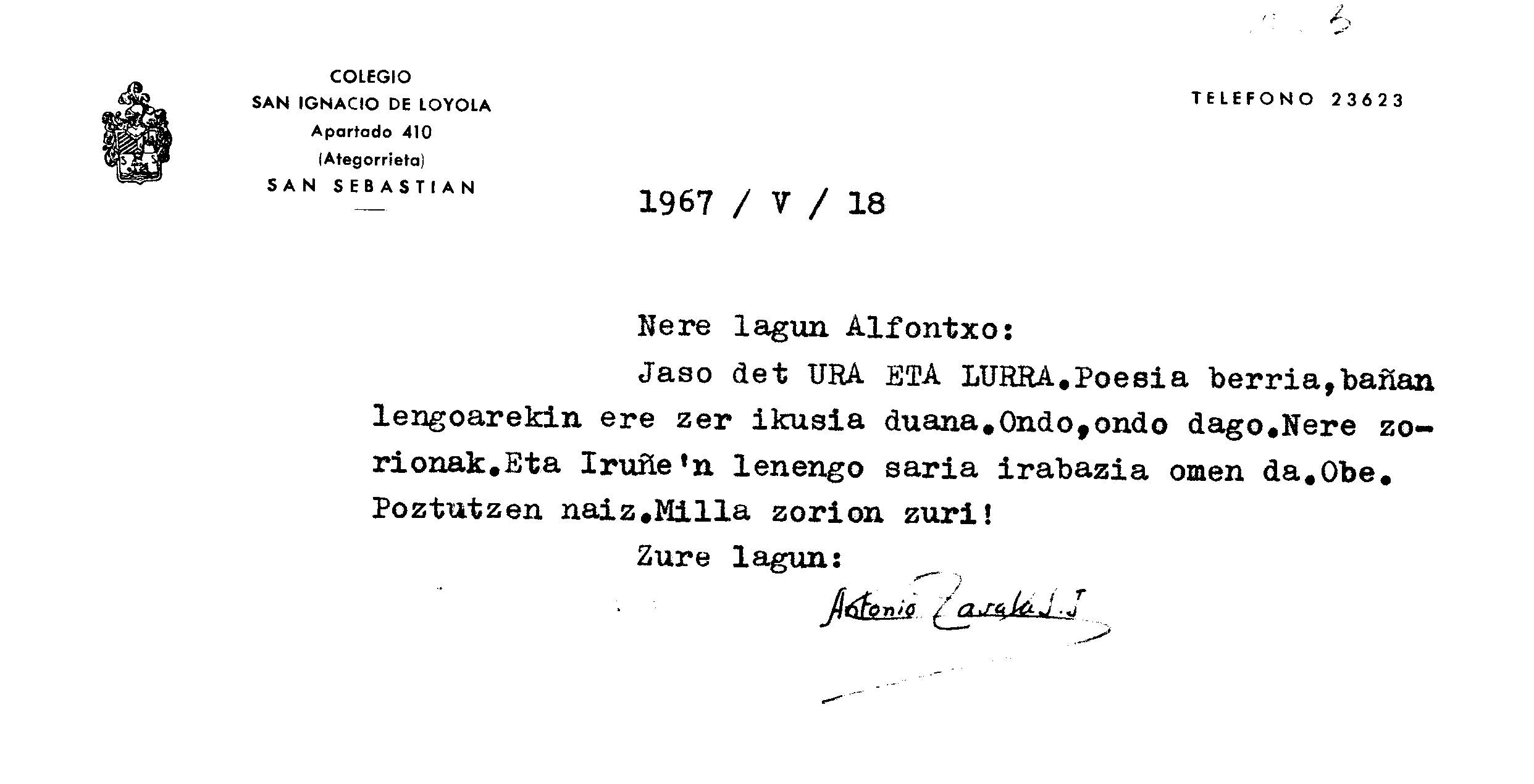 Euskaltzaindia. Gutunak: Zavalaren gutuna Irigoienek Iruñean irabazitako olerki sariari buruz
