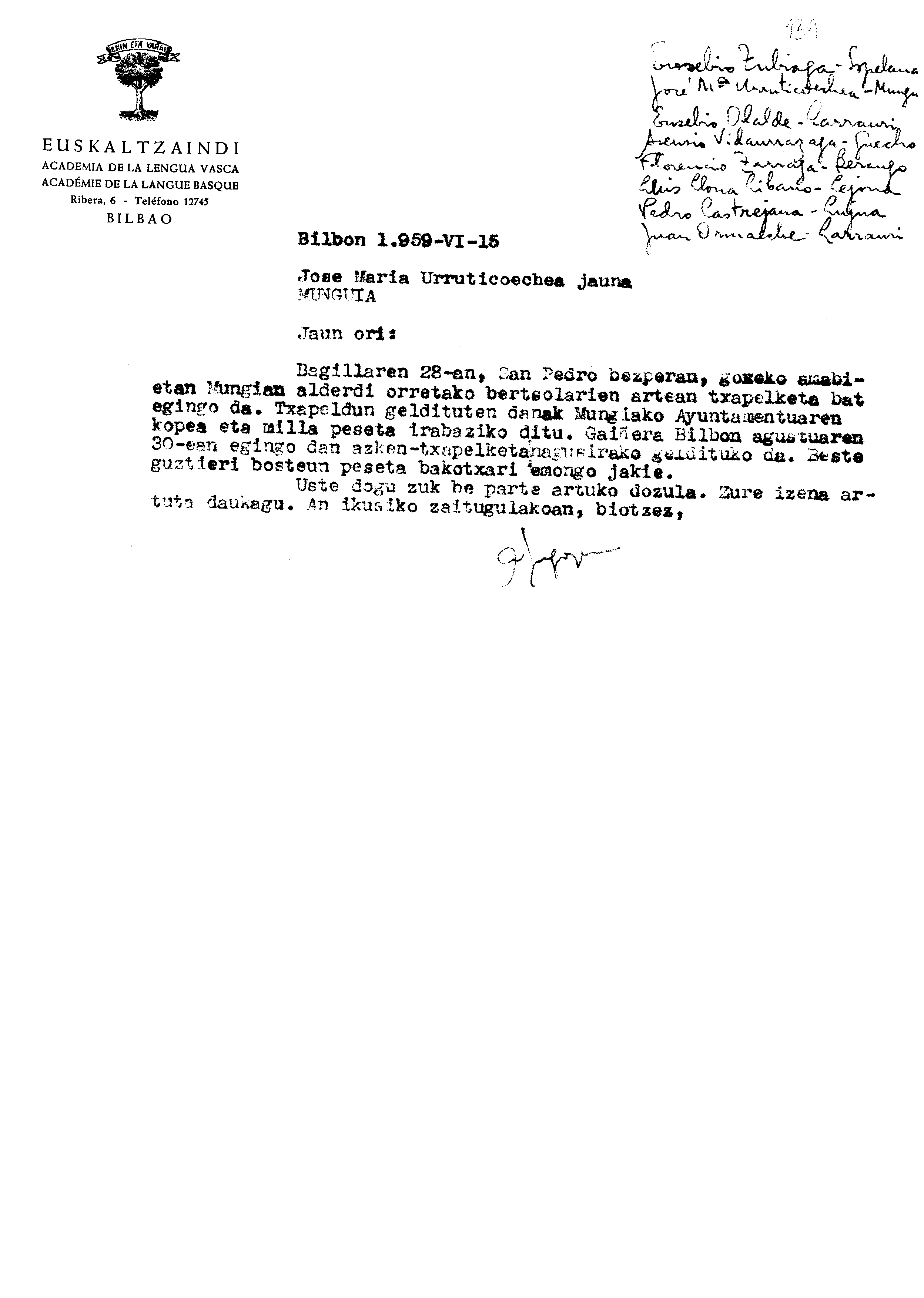 Bizkaiko Bertsolari Txapelketa 1959 : Mungiako saioan parte hartzeko gonbidapena