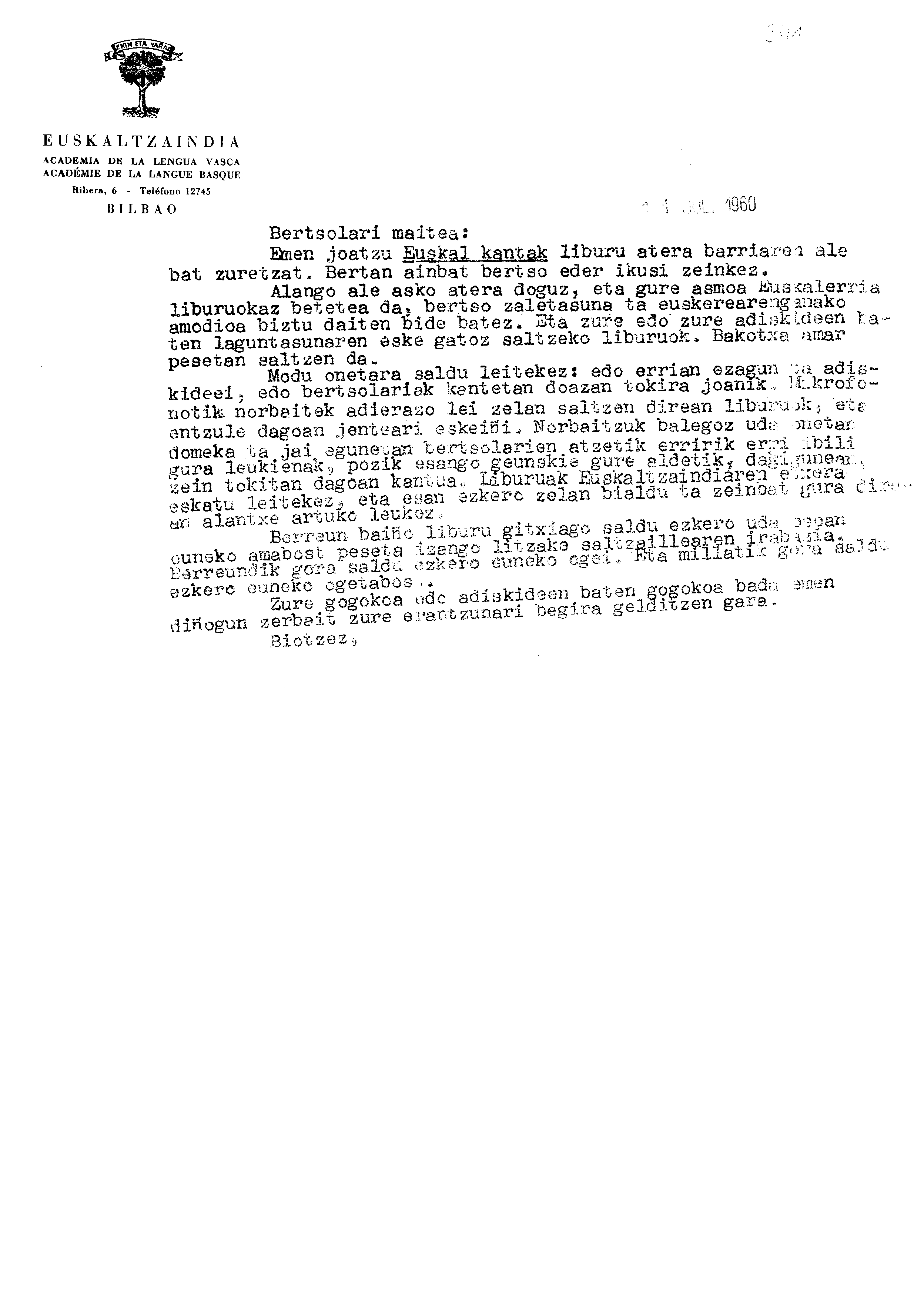 Bertsolaritza: Bertsolariei zuzentzen zaien gutuna Euskal-kantak oparituz eta beraien bertso saioetan liburuaren propaganda egitera animatuz