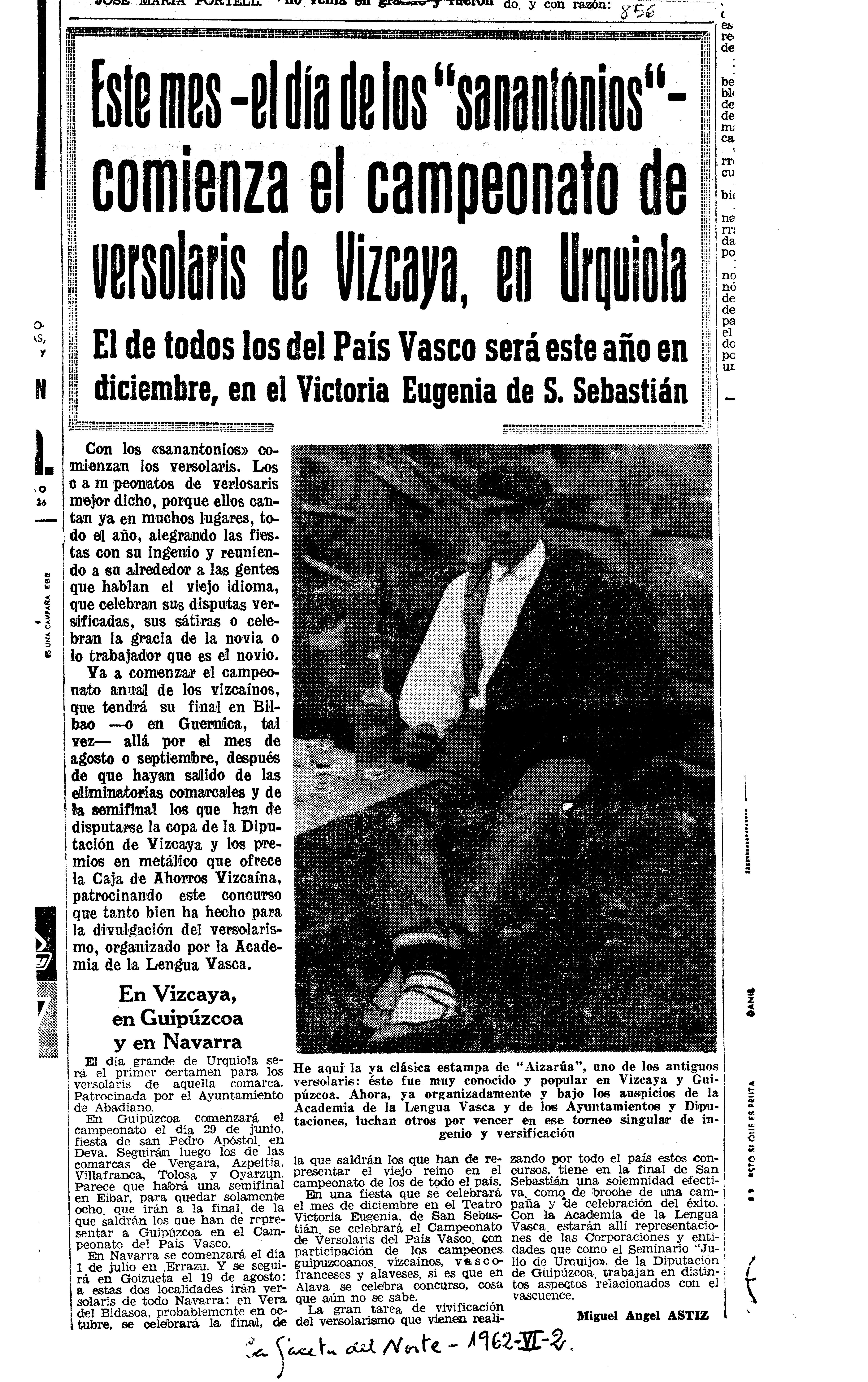 Bertsolaritza: Izenburua : Este mes-el día de los "sanantonios"- comienza el campeonato de versolaris de Vizcaya, en Urquiola