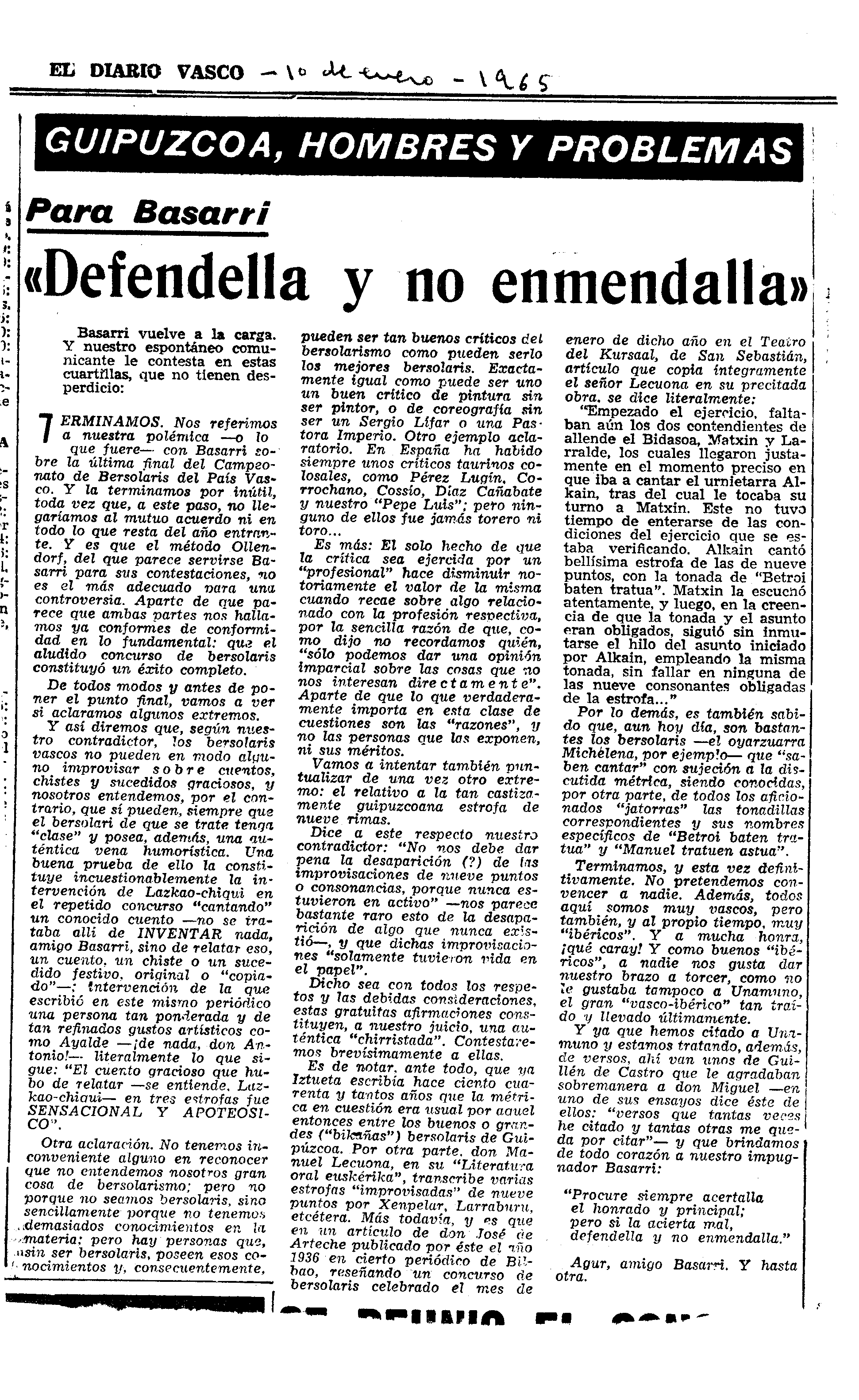Bertsolaritza: Izenburua : Para Basarri, "Defendella y no enmendella"