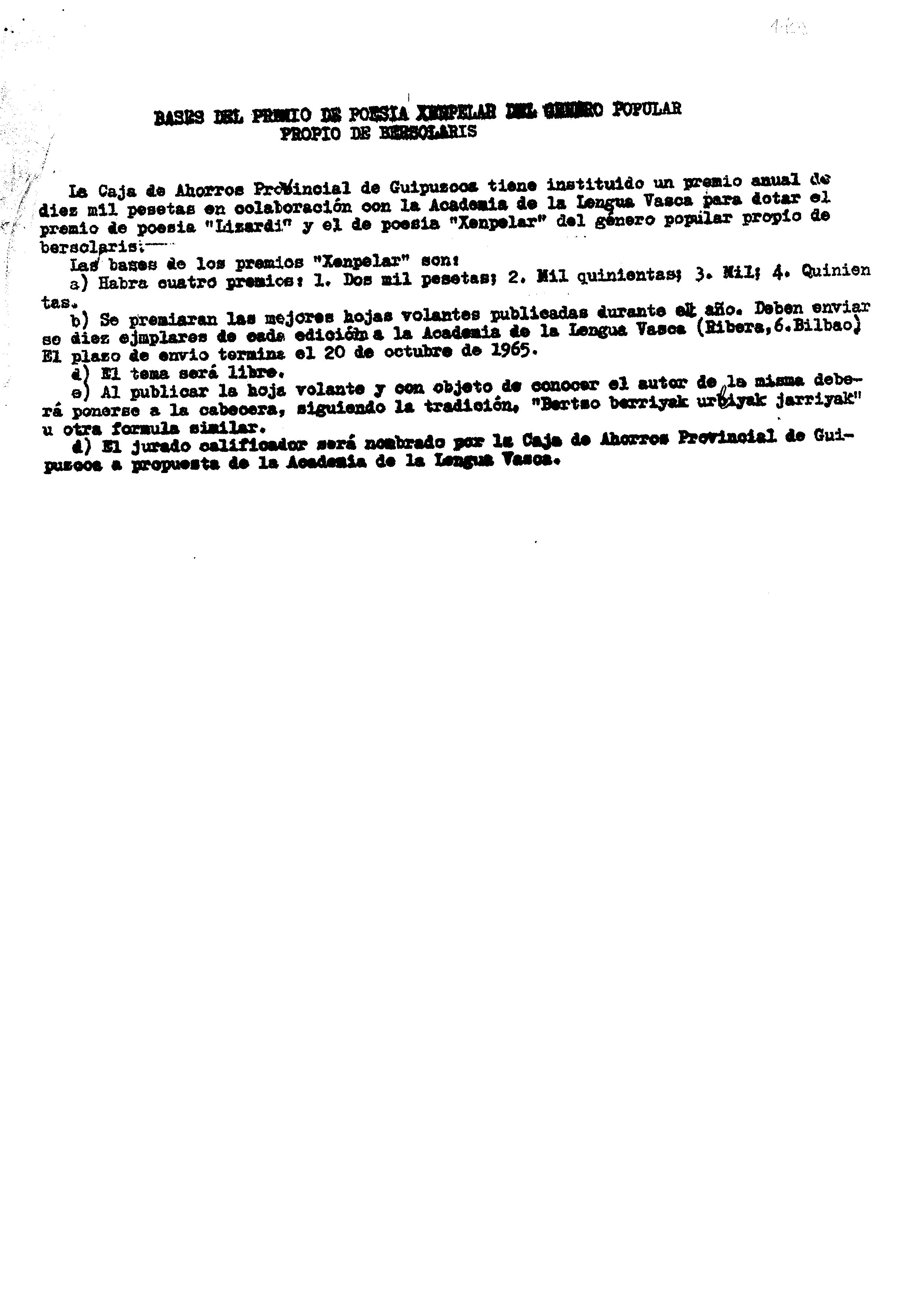 Bertsolaritza. Euskaltzaindiaren sariak. Xenpelar saria 1965