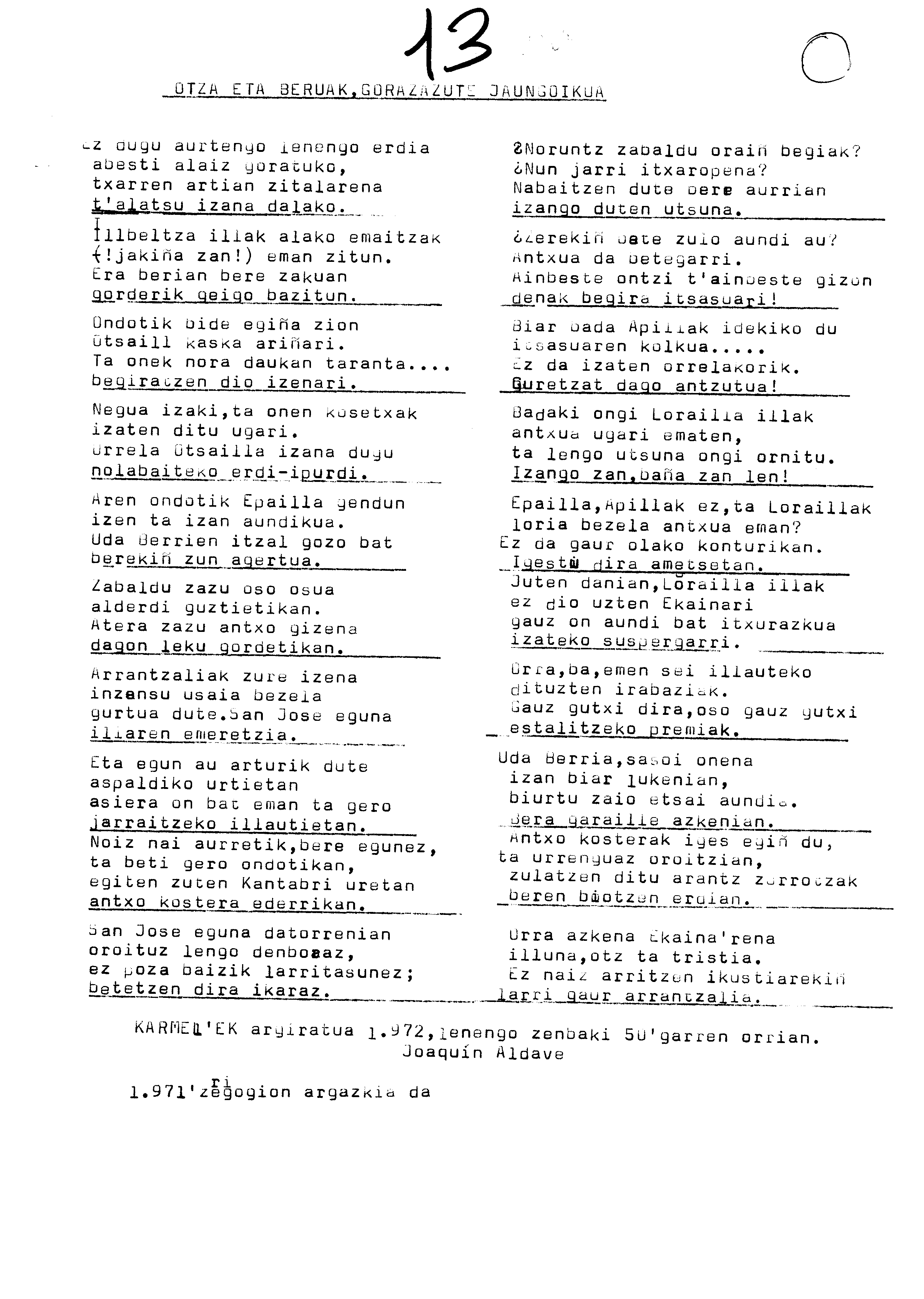 Euskaltzaindiaren sariak. Xenpelar saria: Izenburua: Otza eta beruak, gorazazute jaungoikua