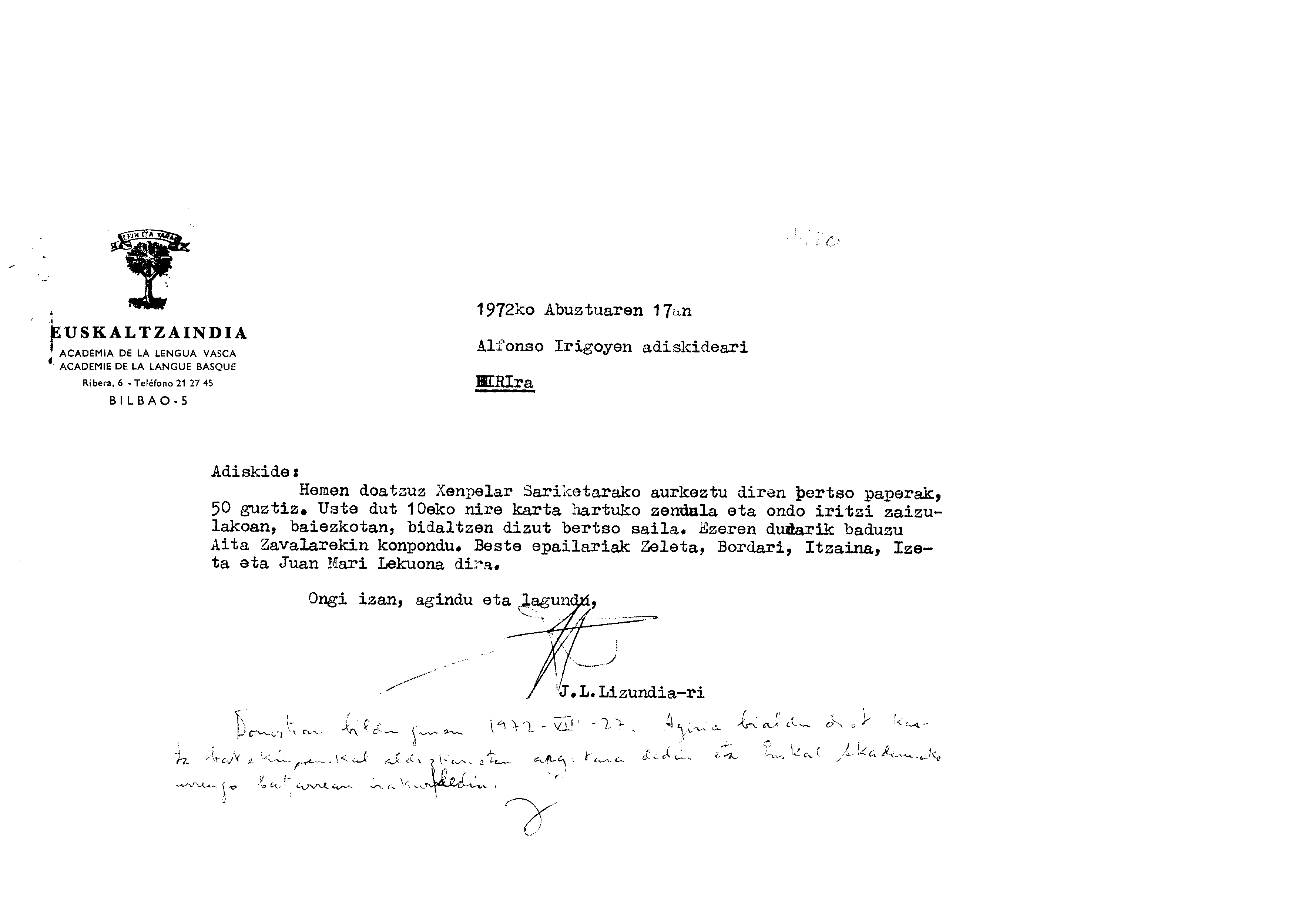 Euskaltzaindiaren sariak / Xenpelar saria: Lehiakerara bidali diren bertso-paperak igorriaz
