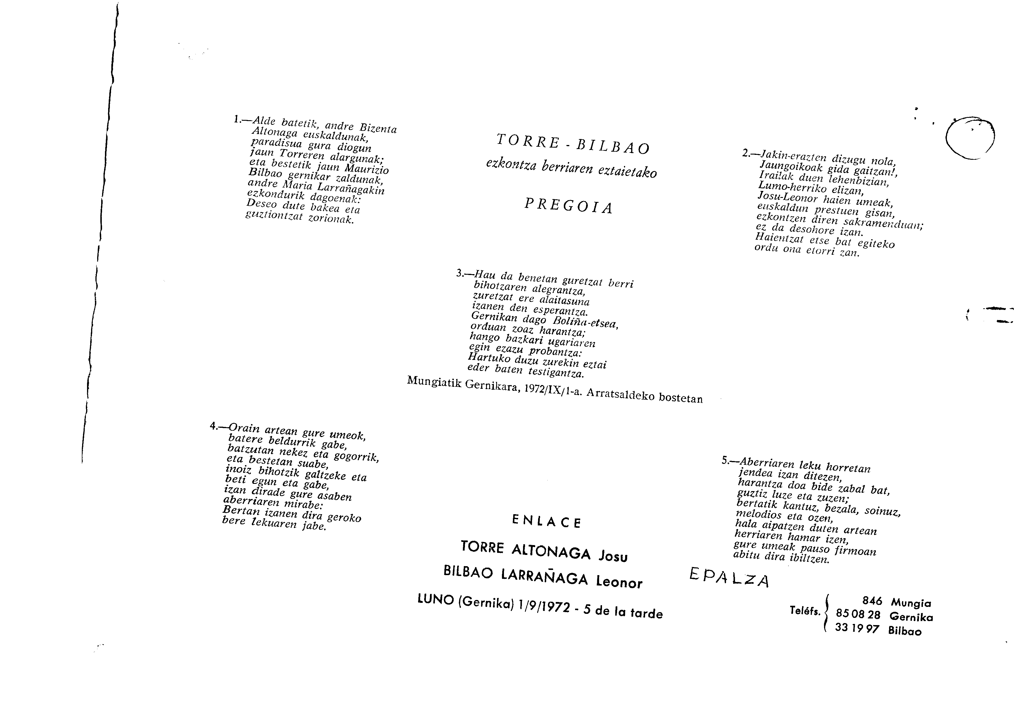 Euskaltzaindiaren sariak. Xenpelar saria: Izenburua: Torre-Bilbao ezkontza berriaren eztaietako