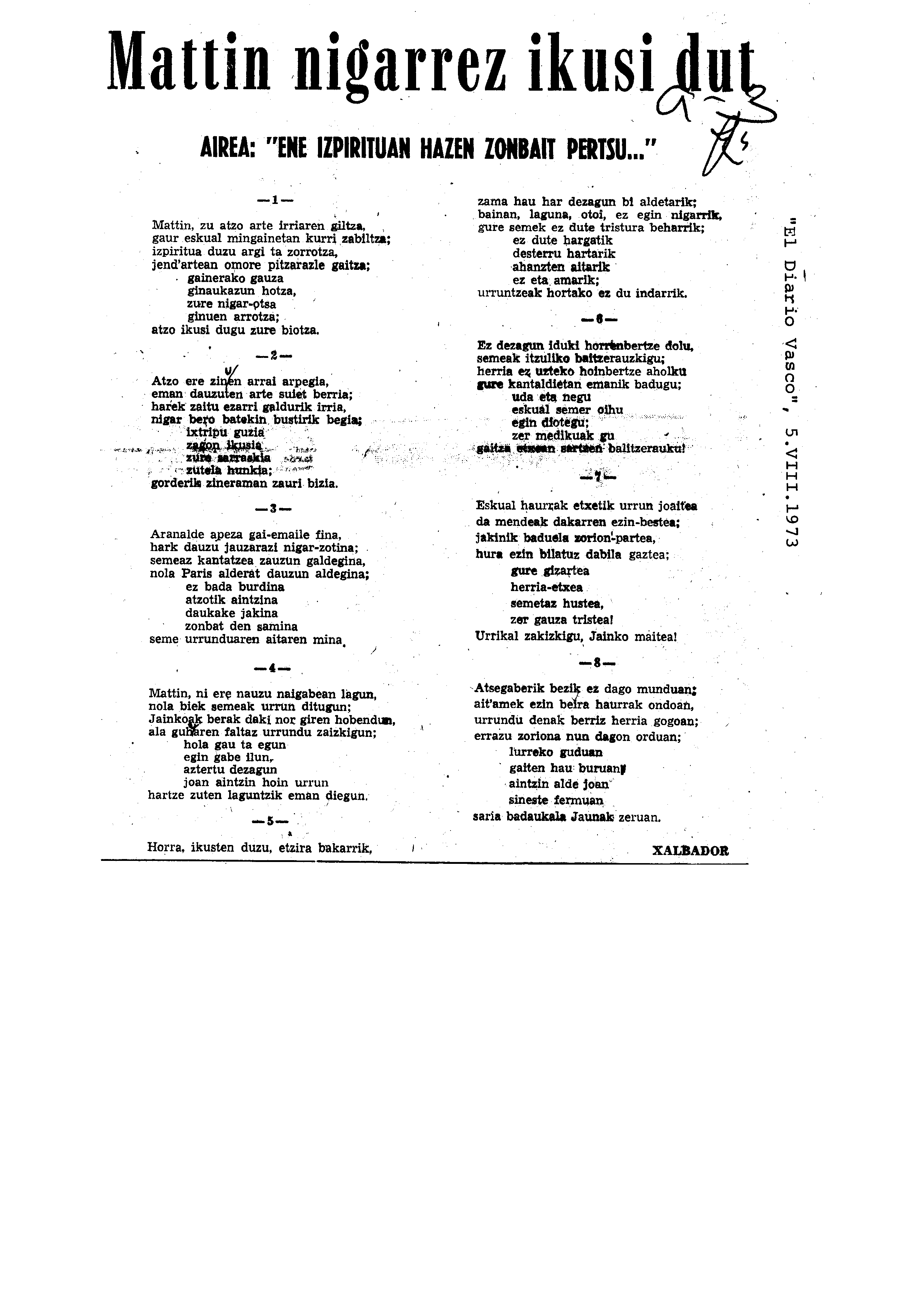 Euskaltzaindiaren sariak. Xenpelar saria: Izenburua: Mattin nigarrez ikusi dut