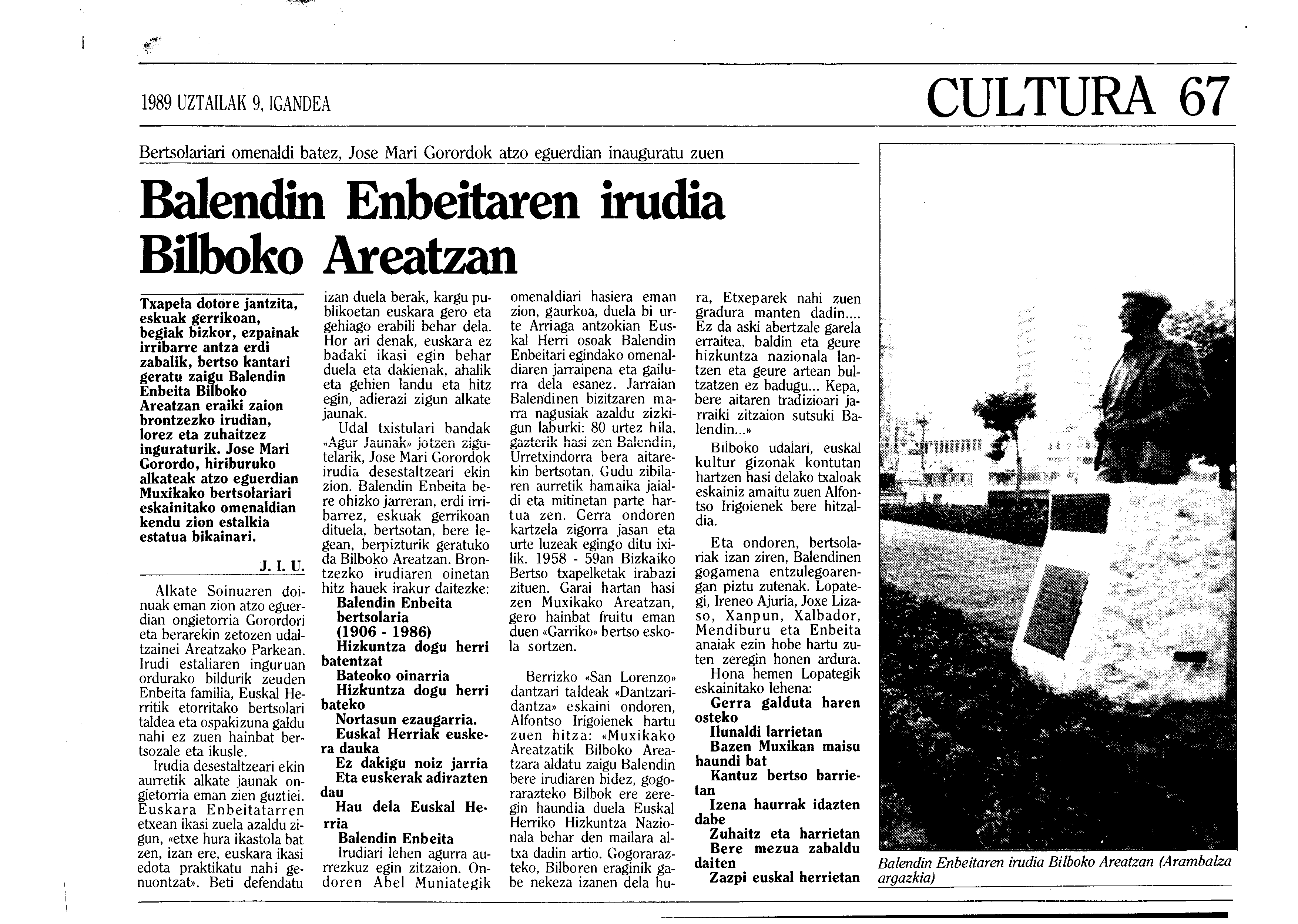 Irigoienen lanak. Idazlanak: Izenburua: Balendin Enbeitaren irudia Bilboko Areatzan